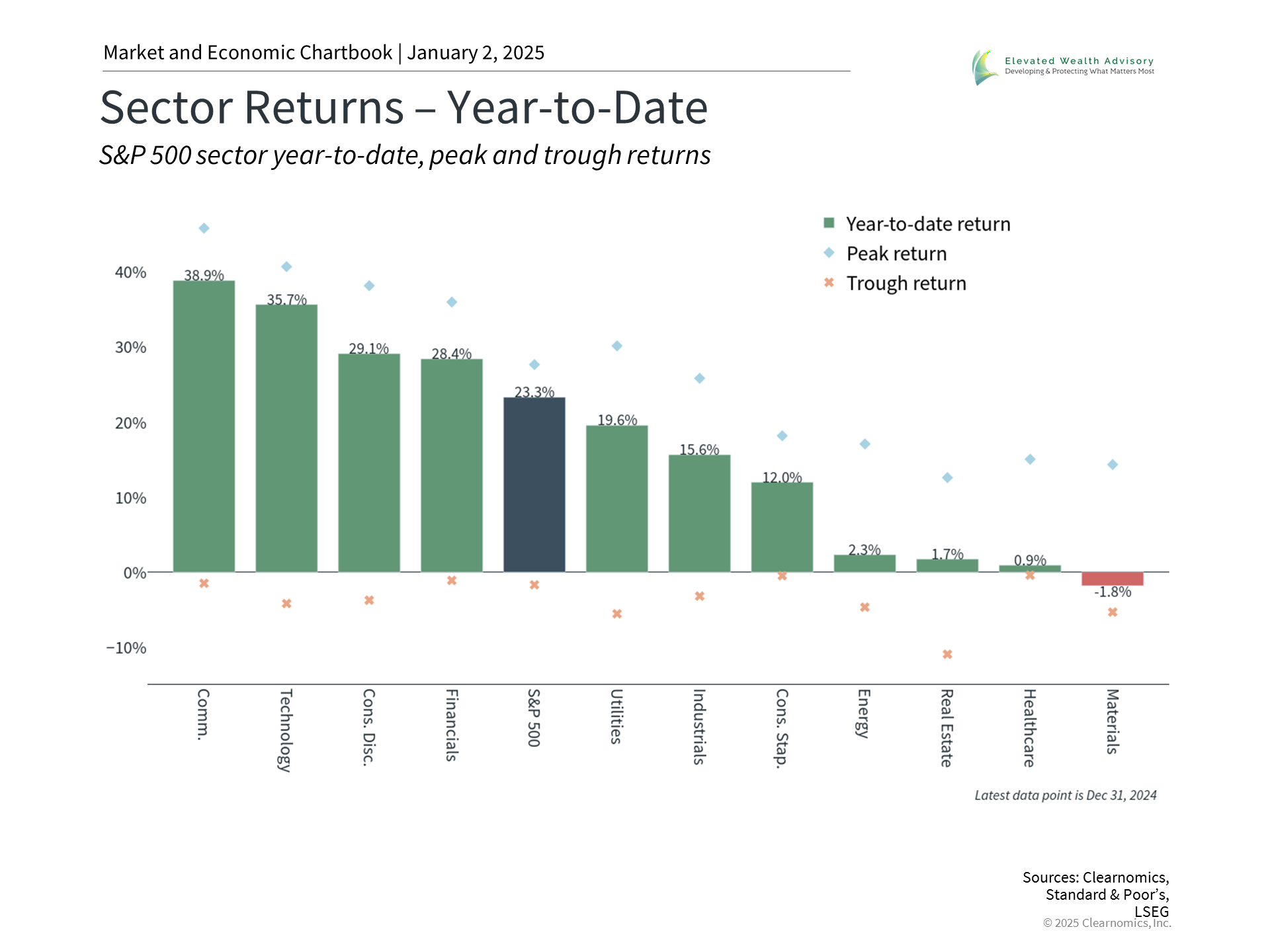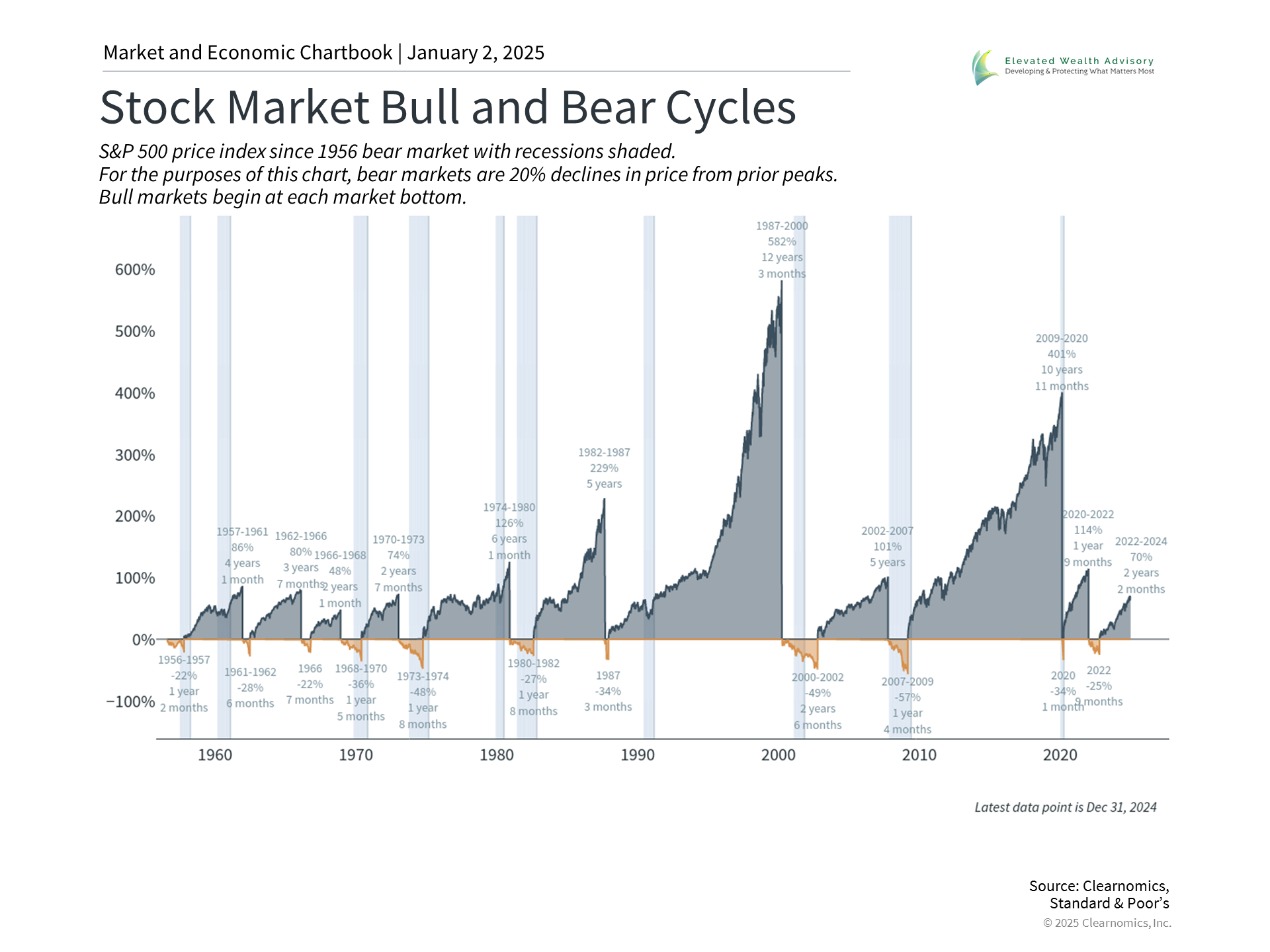 The bull market reached its two year anniversary in 2024The S&P 500 reached 57 new all-time highs during 2024 and ended near all-time highs, although markets did pull back slightly at the end of December. This performance adds to the remarkable gains since the market bottom in late 2022 which, in hindsight, marked the beginning of the current bull market. The market has experienced the best two years of performance since the late 1990s, with the stock market gaining 57.8% across 2023 and 2024. In fact, there were only two periods of heightened market volatility last year. This may be surprising given how nervous investors were throughout the year. These occurred in April and August when the market pulled back 5% or more due to concerns around inflation, the Fed, and tech stocks. However, each episode was followed by a sharp rebound. The accompanying chart puts bull and bear market cycles in perspective. History shows that bear markets are unpleasant, but they tend to be brief compared to bull markets. While it’s hard to say how long the current expansion will last, it’s important for investors to position for the full cycle and not just for downturns. Of note, policy rates did decline a full percentage point due to Fed rate cuts, despite longer-term interest rates remaining elevated. The 10-year Treasury yield, for instance, ended just under 4.6%, after fluctuating between 3.9% to 4.7% throughout the year. The overall bond market was slightly positive with a gain of only 1.3% due to these rate movements. Most sectors experienced strong returns last year