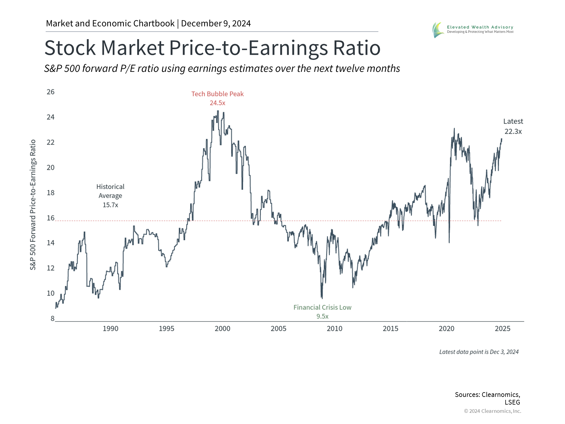 A year ago, investors spent much of their time worrying about a “hard landing” as the Fed kept rates high to fight inflation. Fortunately, this never materialized. Instead, inflation is returning to pre-pandemic levels, the job market is healthy, and economic growth is steady. Few investors expected such a positive scenario twelve months ago. The Consumer Price Index, a measure of inflation, has slowed to only 2.6% year-over-year. Unemployment remains low at only 4.2%, and 2.3 million new jobs have been created over the past twelve months. GDP growth, at 2.8% in the third quarter, has been stronger than many economists anticipated. This economic expansion has helped to propel many asset classes. U.S. stock market indices are near all-time highs, international stocks have continued to rise, and bonds have performed better in recent weeks with interest rates moderating. Gold is near record levels due to demand from investors and central banks. Bitcoin has also risen to historic highs following the presidential election. This does not mean there are no challenges ahead. Consumer spending could slow as excess savings are spent, and debt levels are high for both households and businesses. Assets that have risen sharply could experience greater volatility as well. In times like these, focusing on fundamentals such as earnings and valuations will be important. 2. Expensive stock market valuations underscore the need for portfolio management