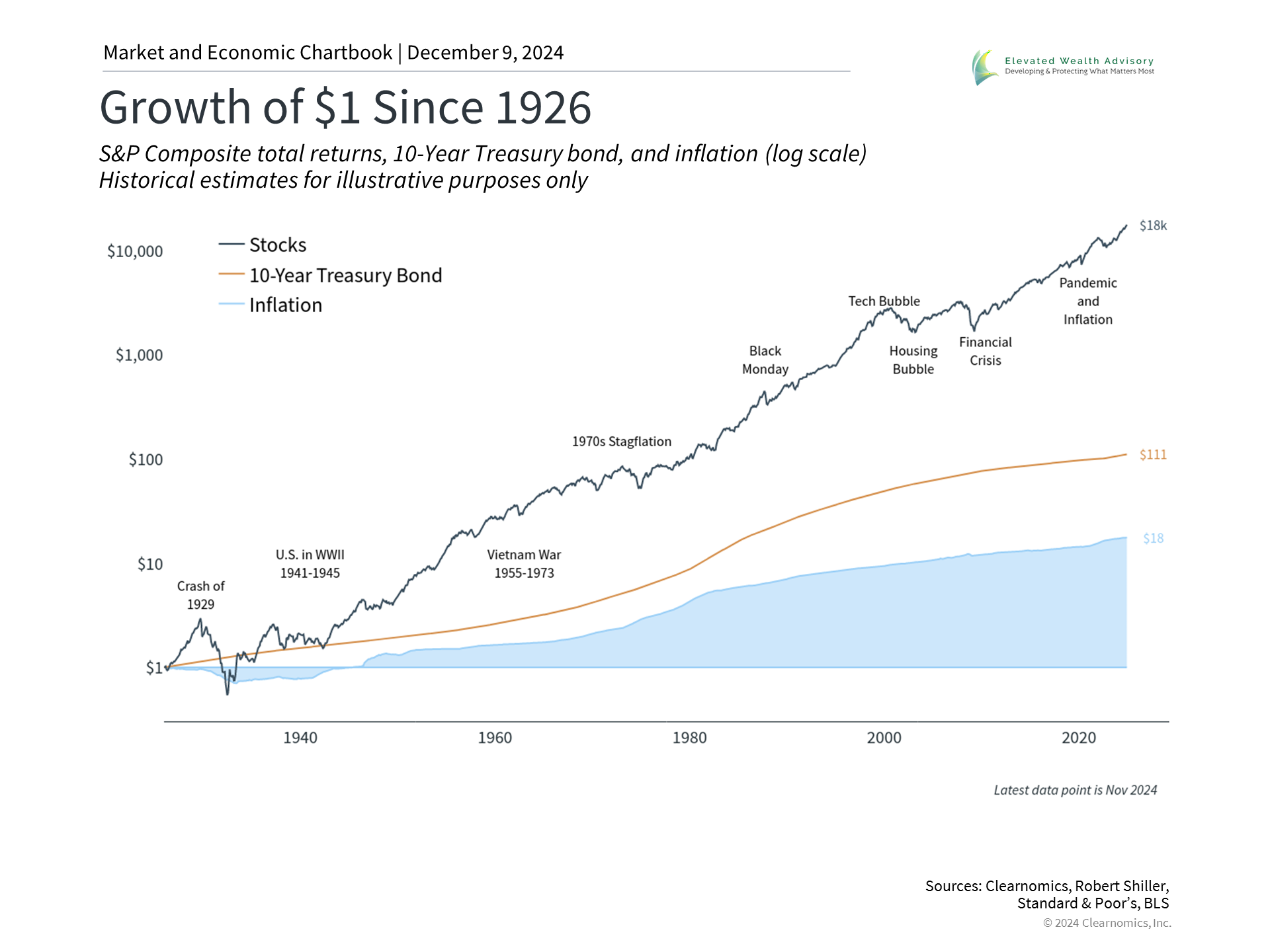 Perhaps the most important lesson of 2024 is that markets can perform well in spite of investors’ worst fears. For example, market pullbacks in April and August this year may have led some investors astray, despite positive gains throughout the year. Markets have shown remarkable resilience over the past twelve months, supported by economic growth, innovation, and positive trends across many asset classes. It’s important to celebrate these positive outcomes, while also remaining vigilant and focused on the long-term. The accompanying chart shows the value of having a long-term perspective. History reveals that true wealth is created not over months, but over years and decades. Even for those already in retirement, having a longer-term perspective allows investors to put short-term events in context and make productive decisions. The bottom line? As the year comes to a close, we can celebrate a strong year for markets. In 2025, investors should focus on finding balance in their portfolios. History shows that this is the best way to manage unforeseen events, while staying on track to achieve long-term financial goals. | |||||