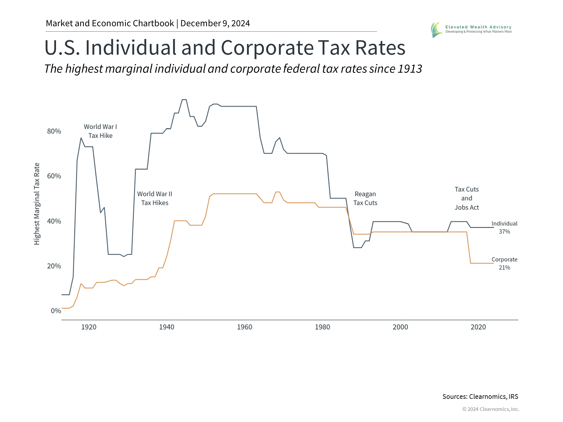 Presidential politics also clouded markets leading up to election day in November. Since then, the stock market has rallied due to the lifting of policy uncertainty, and the hopes that the incoming administration will create a pro-growth environment. Of course, just under half of the country does not agree with the new administration’s policies. National politics have only grown more divisive in recent years, and it is often difficult to separate personal views from investment decisions. While politics are important in our personal lives, the reality is that the economy and stock market have performed well across both Democratic and Republican presidencies over the past century. When it comes to investing, business cycles matter more than who occupies the White House, and they are driven by many factors beyond politics. In 2025, investors should put politics aside as they construct their portfolios and financial plans. Taxes, for instance, are clearer after the election since it is likely that most provisions of the Tax Cuts and Jobs Act will be extended. This affects individual income tax rates, corporate tax rates, estate taxes, and much more. As is always the case, working with a trusted advisor is the best way to ensure that your financial strategy considers tax implications and changing market conditions. This does not mean that politics will be out of the spotlight in the coming months. Issues such as trade wars and the budget deficit will continue to worry investors. On trade, the new administration is expected to raise tariffs across many trading partners, especially China. However, it’s important to remember that the worst-case predictions during the first Trump administration never materialized, and many tariffs were continued during the Biden administration. When it comes to debt ceilings and the growing federal deficit, there are no simple solutions. The national debt has grown to $36 trillion with no signs of slowing. Without a sustainable path, interest payments on the federal debt will continue to rise, credit rating agencies may continue to question the quality of U.S. debt, and the role of the U.S. dollar as the world’s reserve currency could become uncertain. Without minimizing the severity of this topic, it’s important to recognize that we are not at a tipping point just yet, and markets have historically performed well regardless of the level of the deficit and national debt. 5. Long-term thinking will be key to success in 2025 and beyond