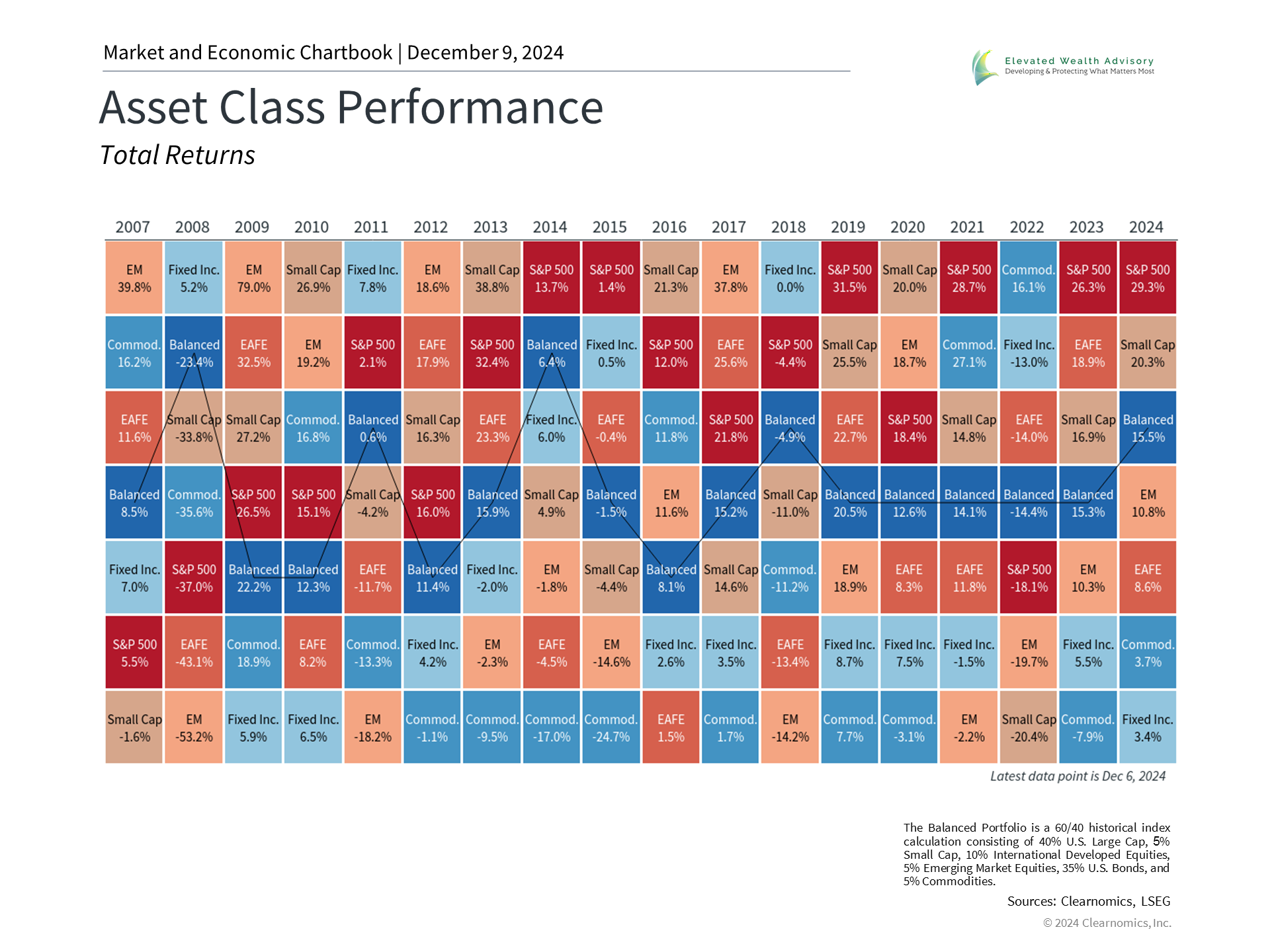 The 19th century author Balzac wrote that “our worst misfortunes never happen, and most miseries lie in anticipation.” This quote perfectly captures 2024, a year of major market, economic, and political concerns for many investors. Worries over a “hard landing” recession, market pullbacks, election turmoil, and more drove market sentiment to extremes. Yet, as we approach the end of the year, many of the miseries that investors feared did not take place. Instead, the S&P 500 is near record levels, inflation is subsiding, the economy is growing steadily, and the Fed has begun to cut interest rates. This is a reminder that excessive worry can lead investors to make decisions that may not serve their long-term interests. If the past few years have been about extremes – the bear markets of 2020 and 2022, compared to the sharp rebounds in 2021, 2023, and 2024 – then 2025 should be about regaining balance. This is as much about investor emotion as it is about the economic data. History shows that those who can maintain a disciplined, long-term approach are better positioned to achieve financial success. This will only grow in importance in the coming year. Stock market valuations are well above average, the path of interest rates is uncertain, doubts about artificial intelligence are emerging, and geopolitical risks are escalating. There will likely be many more unforeseen events that will heighten investor concerns. Fortunately, the lessons of the past year can guide financial decisions in 2025 and beyond. Below, we present five important insights that can provide investors with perspective even when the world seems uncertain and other investors fear the worst. 1. A stronger-than-expected economy has supported all asset classes