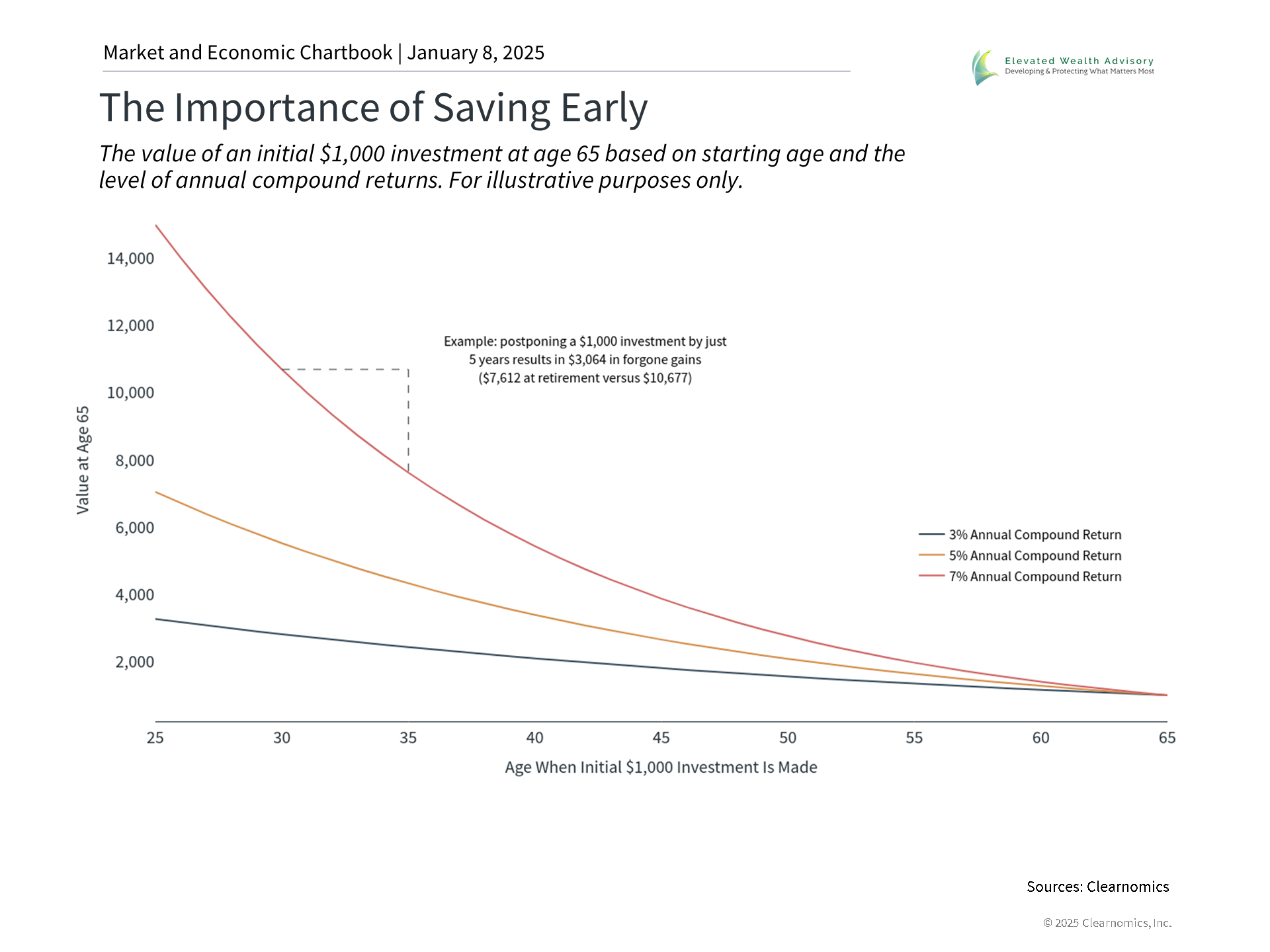 Just as you might plan your fitness goals, revisiting your financial roadmap can help guide you through the coming year. This could include reviewing your financial situation, setting realistic savings targets, and ensuring you have an appropriate investment plan. In particular, managing your asset allocation in a way that is tailored to your return objectives and risk tolerance is an important way to stay on track regardless of market and economic events in 2025. So, whether your goals involve advancing your investment plan, building an emergency fund, reducing debt, or growing your retirement nest egg, breaking these objectives into manageable actions can make them less daunting and more achievable. Below are three key ways to get started today. There is an often quoted proverb that states “the best time to plant a tree was 20 years ago. The second best time is now.” This is because time in the market is one of the most powerful wealth-building tools, thanks to the power of compound returns. When investment returns are reinvested, they can generate their own returns, creating a compounding effect that turns savings into real wealth over decades. For example, the accompanying chart shows how waiting even a few years can have a large impact. For an investor who experiences 7% average returns, beginning to invest when they are 35 rather than 30 means their original $1,000 investment grows to $7,612 instead of $10,677 when they retire. The same pattern is true whether those average returns are 3%, 5%, or 10%. Over the course of an investment lifetime, these differences add up and can become significant. Even small contributions can grow substantially over decades through the compounding process. What prevents some from investing is the fear of market swings, especially with markets near all-time highs. However, the reason those who can stay invested are rewarded in the long run is exactly because it is difficult to do so. When investors exit the market due to short-term concerns, they create opportunities for disciplined investors to buy at even more attractive prices, setting the stage for higher future returns. This is why keeping a level head, and investing over long periods of time, are the best ways to achieve financial goals. Resolve to review your retirement accounts