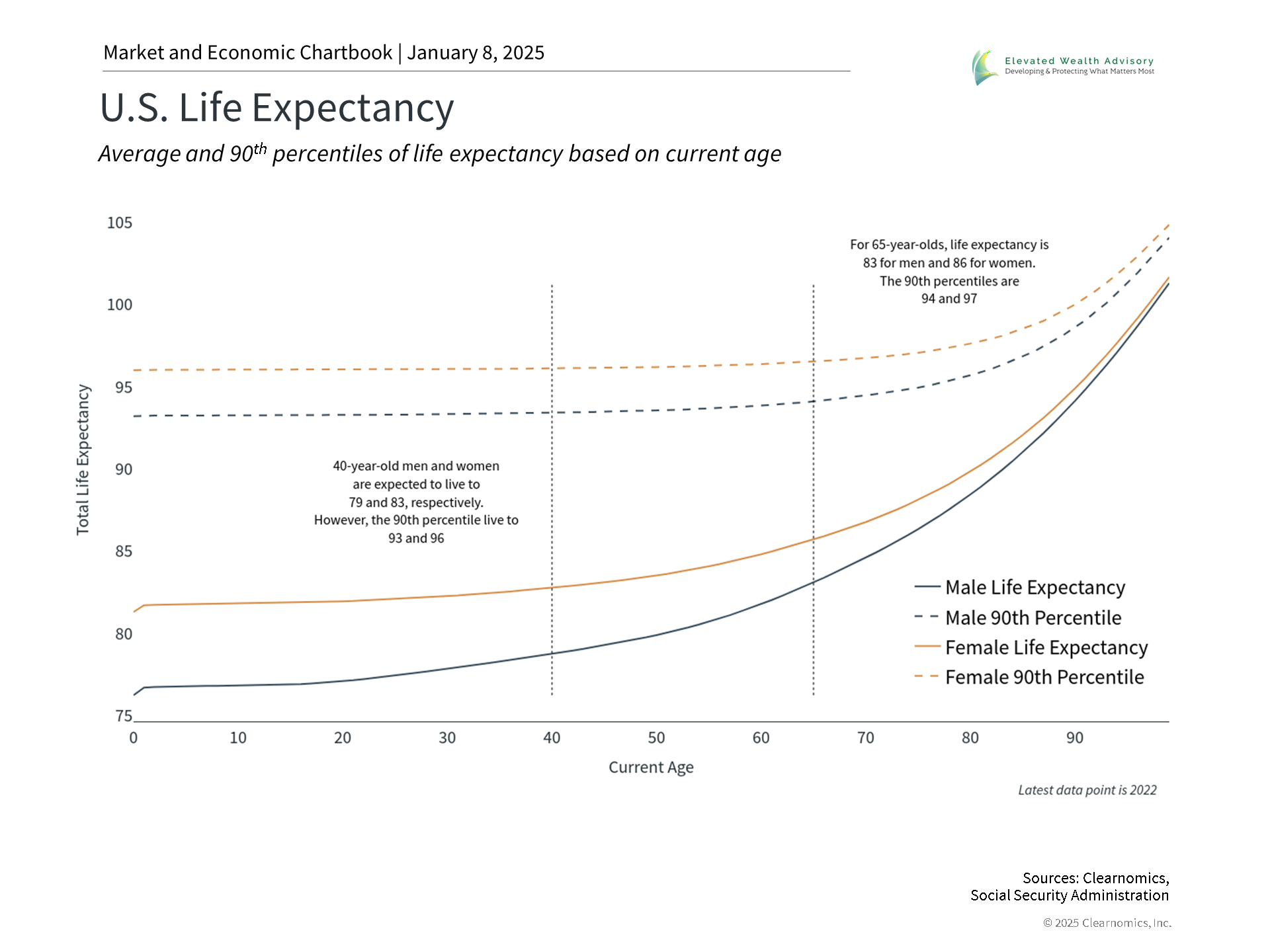 The fact that life expectancies continue to rise is unambiguously positive. Yet, perhaps the greatest financial risk for any retiree is the prospect of running out of funds, also known as “longevity risk.” The goal of addressing longevity risk is to ensure that retirees can enjoy a long and healthy retirement without worrying about their finances. Today, savings have to last longer and generate more income than for prior generations. For many, longer life expectancies could mean spending 30 years or more in retirement. Just as importantly, these savings also need to continue growing to support longer and longer retirements, especially during inflationary periods. The accompanying chart shows that, according to the Social Security Administration, today’s 40-year-old men and women are expected to live to 79 and 83 on average, respectively. However, one in ten could live to 93 and 96, or longer. For those who are already 65, life expectancies are even higher. These demographic statistics suggest that, for many, planning for a retirement that lasts to the age of 80 is not enough – it could extend for decades beyond that. Factors like healthcare costs, inflation, and sustainable withdrawal rates become even more critical when planning for an extended retirement. It’s clear that understanding and preparing for longevity risk is essential for maintaining financial security. By adding financial fitness to other health and life goals, you can fund a longer retirement and ensure you don’t lose sleep over money. The bottom line? The start of the year is a great time to set your financial New Year’s resolutions. Saving early, reviewing your retirement plans, and ensuring your portfolio creates enough income and growth are all critical to achieving long-term financial goals. | |||