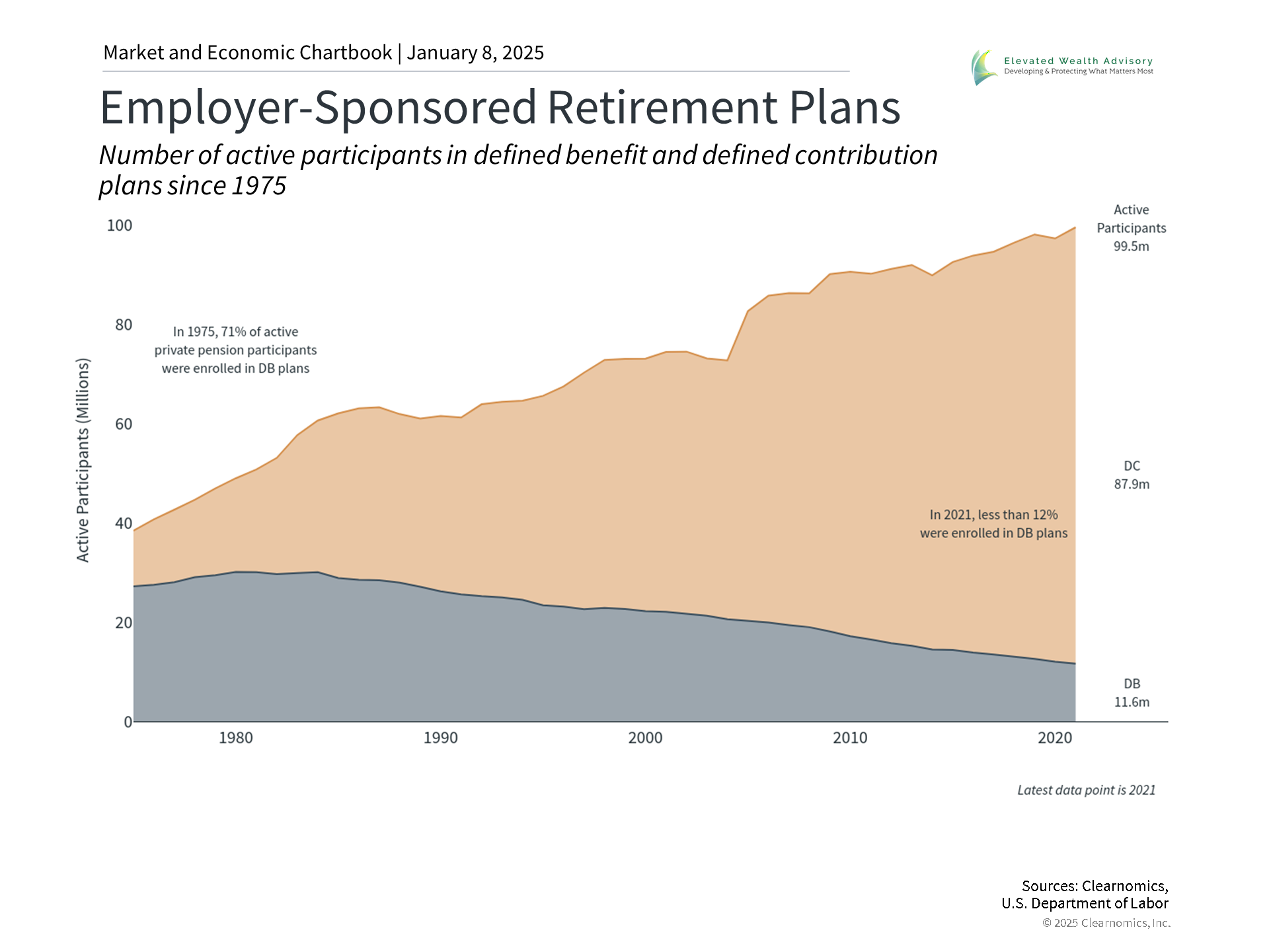 The retirement landscape has changed dramatically over the past half century, with a significant shift from traditional pension plans to “defined contribution” accounts. It used to be that most companies offered “defined benefit” plans, where workers were guaranteed a specific payment amount in retirement. Today, defined contribution plans like 401(k) and 403(b) plans are far more common, as shown in the accompanying chart. This transformation has fundamentally changed our responsibilities when planning for retirement. Today the burden is on individual workers to ensure they have the right plan in place for a comfortable retirement. Individuals must make decisions about account types, tax strategies, contribution rates, investment allocations, and distribution strategies. Important considerations to advance your retirement strategy in 2025 include which accounts are most appropriate given your circumstances, whether you qualify for an employer match, what type of investments should be made in each account to maximize tax efficiency, and more. For example, it can make sense for taxable bonds to be held in tax-advantaged accounts since interest payments are often taxed as regular income. While the trend toward defined contribution plans places the burden of funding retirement on individuals, it also presents opportunities to customize your financial plan. After all, it’s unclear what the future of programs such as Social Security and Medicare may be. This is why it’s essential to become educated on the best approach for your situation, ideally with the help of a trusted advisor. Resolve to consider the impact of a longer retirement