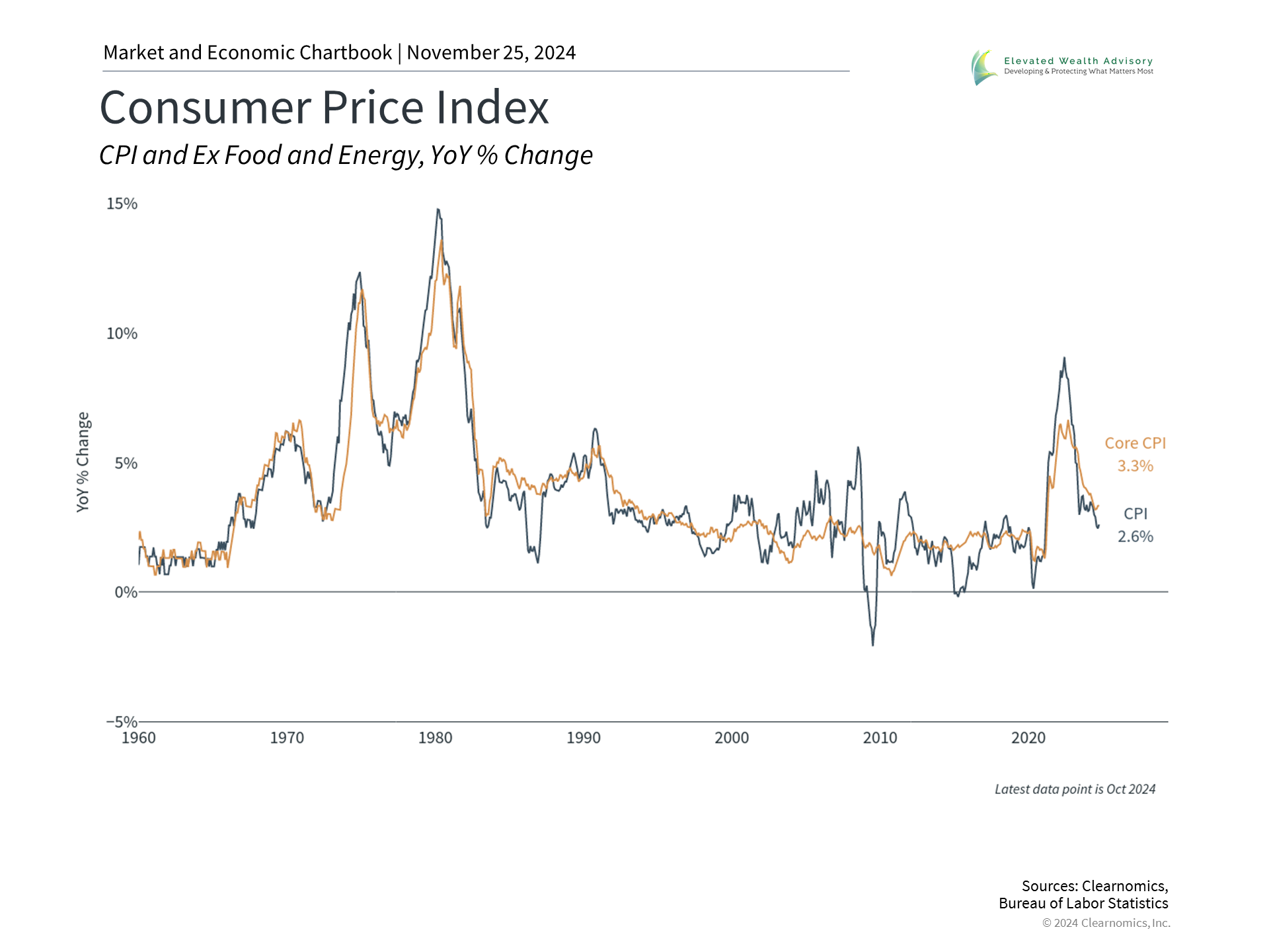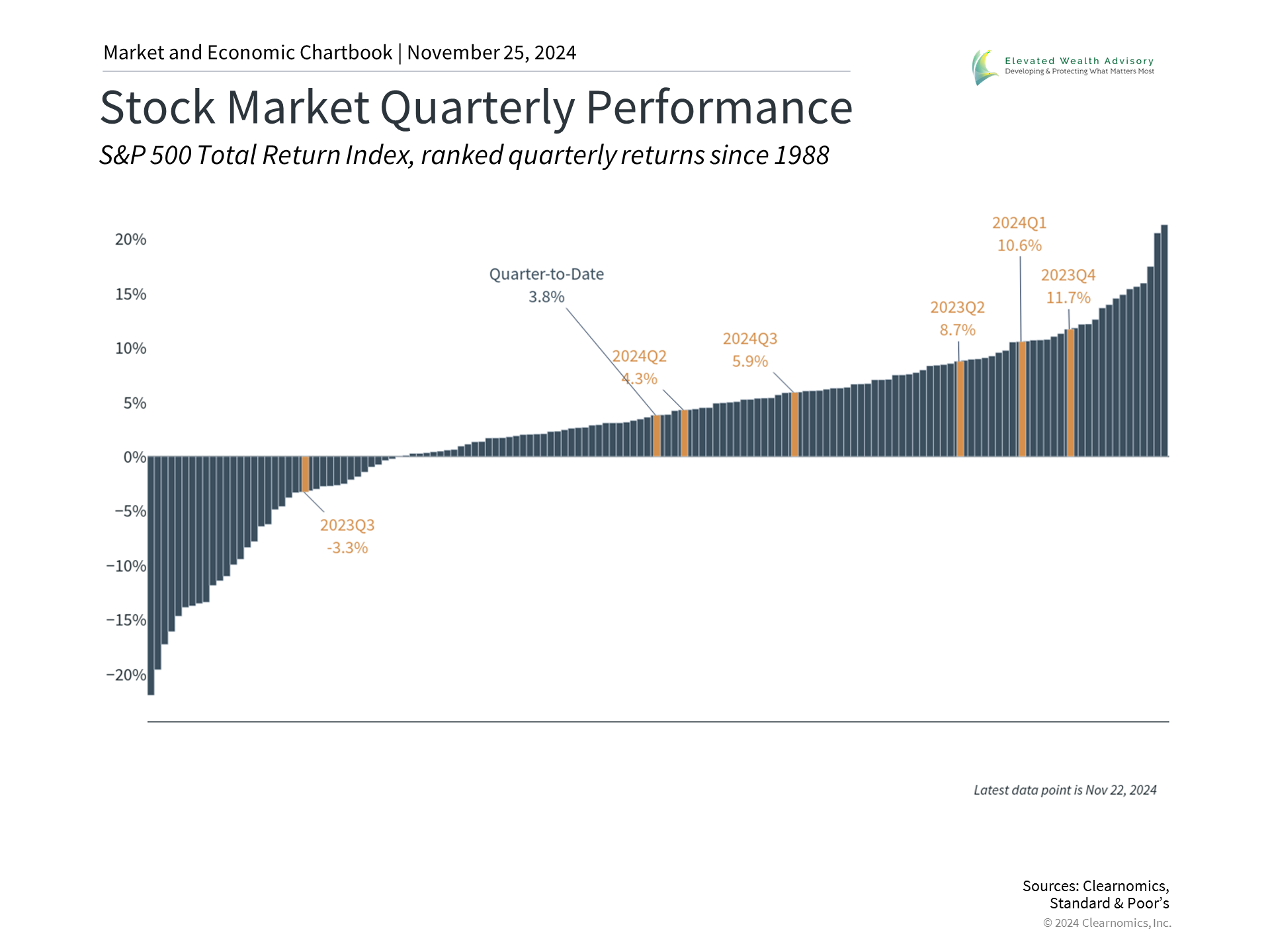 Just as many express gratitude in their personal lives, the holidays are a good time to do so in our investing and financial lives. This is important because investors tend to focus only on what can go wrong. Even after two strong market years, there is no shortage of concerns on issues such as market fundamentals, the direction of the economy, the size of the national debt, global instability, and more. While past performance is no guarantee of future success, what history shows is that staying focused on the long run is the best way to achieve financial goals. Over the course of days, weeks and months, markets can fluctuate significantly just as they did in April and August, or in 2020 and 2022. However, over longer time horizons, markets have tended to rise due to the strength of economic growth. What can investors pause to appreciate this holiday season? First, the U.S. stock market has demonstrated impressive strength in 2024. This is due to robust corporate earnings, better-than-expected economic conditions, and improving investor confidence. The accompanying chart shows that except for one quarter, the last two years have experienced steady market returns. While technology and AI stocks have led the way, many other sectors have contributed this year. In fact, most parts of the market are positive year-to-date, and eight of the eleven S&P 500 sectors have generated double-digit returns. The strong bull market since the end of 2022 does mean that valuations are no longer as attractive. The price-to-earnings ratio for the S&P 500 is now 22.3, nearing both recent highs and the dot-com peak of 24.5. Rather than a reason to avoid the stock market, stretched valuations are a reminder to hold a properly constructed portfolio. Owning stocks, or any risk asset, needs to be balanced with asset classes such as bonds to achieve portfolio goals. The end of the year is a perfect time to review your asset allocation, especially after this year’s market movements. Inflation is returning to normal levels