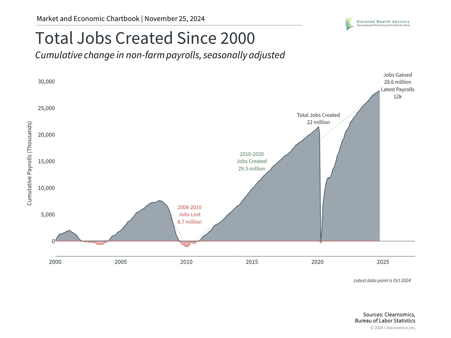 Finally, for everyday individuals, there is perhaps nothing more important from an economic standpoint than the strength of the job market. The fear as the Fed raised rates was that the economy would face a “hard landing” – i.e., bringing inflation down would cause a collapse in hiring. Fortunately, this did not occur. Unemployment is still near historically low levels and job gains have been steady. Wages have also risen, although not as fast as overall inflation. The accompanying chart shows that the economy has created 28.6 million new jobs since the pandemic, far eclipsing the previous level. While job gains differ from sector to sector, this means that many consumers are in a healthy financial position. More broadly, the U.S. economy continues to demonstrate remarkable resilience, with real GDP growing at an annualized rate of 2.8% in the most recent quarter. This is largely due to the strength of consumer spending, which has contributed greatly to overall growth. While this can’t last forever – consumers have largely spent their excess savings from the past few years and debt levels are rising – the hope is that lower rates, clarity around tax policy, and increased business investment will continue to support the economy. The bottom line? Markets never move up in a straight line, and this year was no exception. Still, returns have been historically strong despite periods of volatility. This holiday season, investors should focus on the positives and ensure that their portfolios are aligned with their long-term financial goals. | |||