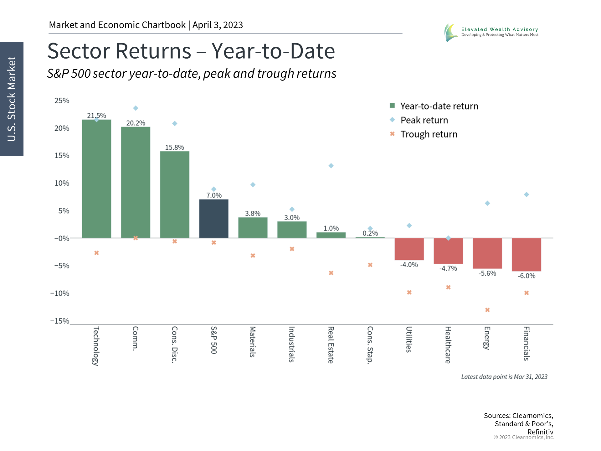 Although only a quarter has passed, markets are already performing much better than last year. This is because interest rates have been more stable and inflation has improved, supporting both stocks and bonds which returned 7.5% and 3.2%, respectively, through the end of the first quarter. A hypothetical 60/40 portfolio generated 5.1% over this same period, underscoring the continued importance of diversification and long-term thinking. 3. Financials have struggled but tech-related sectors have rebounded