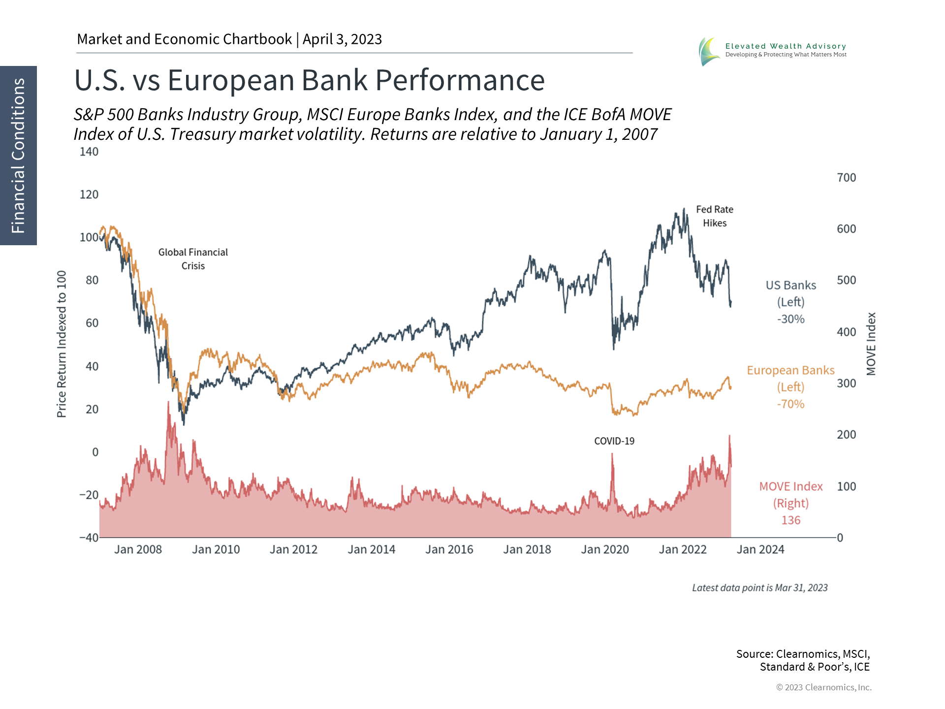 It's no surprise that bank stocks have struggled across markets. In the U.S., this is due to regional banks as the crisis that began with Silicon Valley Bank and Signature Bank plays out. The FDIC, Treasury Department, and the Fed have stepped in to stabilize the system, as have their European counterparts. The accompanying chart shows the performance of U.S. and European banks. Perhaps most striking, however, is that the MOVE index of bond market volatility jumped to its highest level since the 2008 financial crisis. Fortunately, the situation has stabilized as the initial bank run has calmed. Ironically, this has allowed interest rates to fall which will likely reduce the unrealized bond losses at banks that helped create this situation in the first place. While there are specific circumstances underlying each of these bank failures, financial instability tends to occur when monetary policy and credit conditions tighten. This is partly because many banks had grown accustomed to high levels of liquidity supporting deposits and their aggressive customer acquisition practices. Thus, it will take time for the banking system to stabilize as the world adjusts to tighter financial conditions. 2. Balanced portfolios have benefited from both stocks and bonds this year