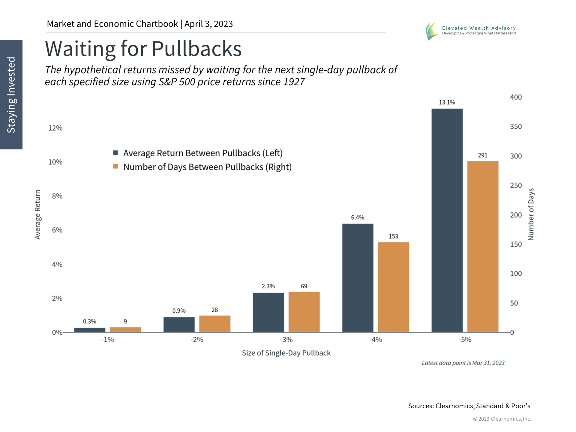 Ultimately, investors should focus on the long run and not overreact to daily headlines. In particular, valuations are still the most attractive in years as investor sentiment slowly improves. The accompanying chart highlights that staying invested, or taking advantage of better market levels, is often rewarded. History shows that waiting for the next pullback often results in missed opportunities both in terms of returns and the length of time investors need to wait. The bottom line? While there are ongoing challenges, this is always the case for investors. Staying focused and holding diversified portfolios is still the best way to achieve long-term financial goals. | |||||