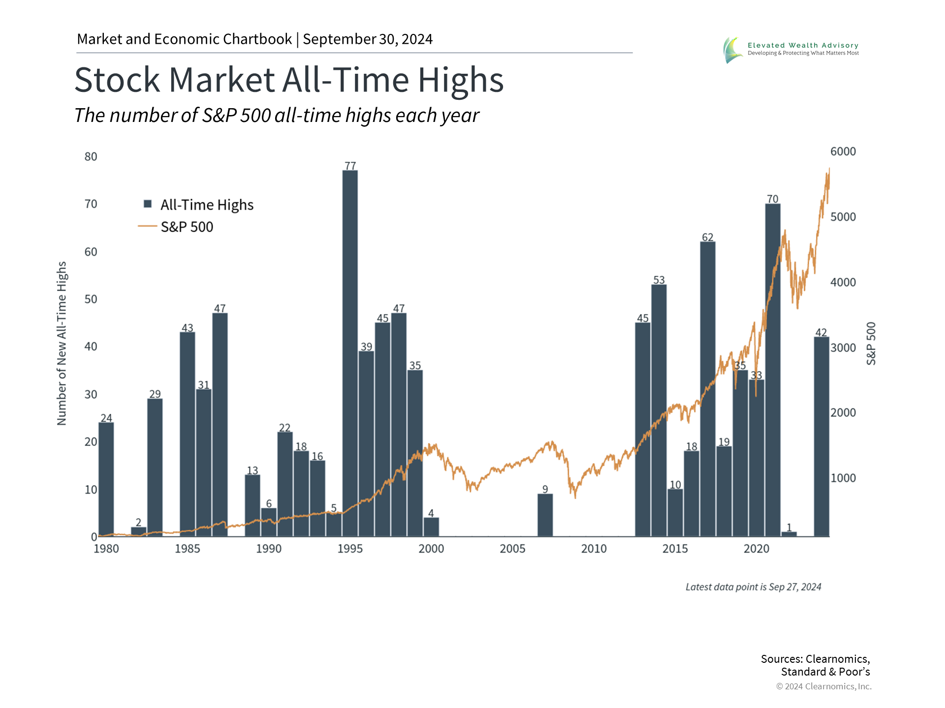 Of course, there are still many risks in the months ahead. The path of Fed policy is uncertain, and investors are already debating the size of the next rate cut. The presidential election is still close and there are wide-ranging implications for tax policy, regulation, trade, and more. Geopolitical conflicts are worsening with possible implications for global stability, supply chains, and oil prices. Market swings are always possible, especially with valuations and earnings expectations at heightened levels. The reality, however, is that facing risks is unavoidable when it comes to investing and planning for the future. How investors choose to react to those risks is ultimately what determines investment and financial success. Rather than trying to time the market to avoid these risks, it’s far better to hold a well-constructed portfolio that can weather different market environments. Below, we provide perspective on five important factors driving the market and what they might mean for investors in the coming months. First, the market has experienced many new all-time highs this year, including during this past quarter. While this performance is encouraging, it can also create unease among investors who may worry that we may be “due for a pullback.” During bull markets, stock indices have historically reached many new all-time highs, as shown in the accompanying chart. This is almost by definition and is a result of sustained earnings, economic growth, and improving investor sentiment. New all-time highs have not been a reliable predictor of market pullbacks since it’s the underlying market and economic trends that matter. Attempting to time the market based only on index levels often proves counterproductive for this reason. Of course, market fluctuations are an unavoidable part of investing, and a decline will inevitably occur at some point. However, predicting the timing of such declines is not only challenging, but markets have historically made both higher highs and higher lows. For example, the pullbacks that occurred in April and August this year are a reminder that the market can sometimes recover faster than many investors expect. While the past is no guarantee of the future, it is often better to simply stay invested than to try to jump in and out of markets. The market has performed well under both political parties