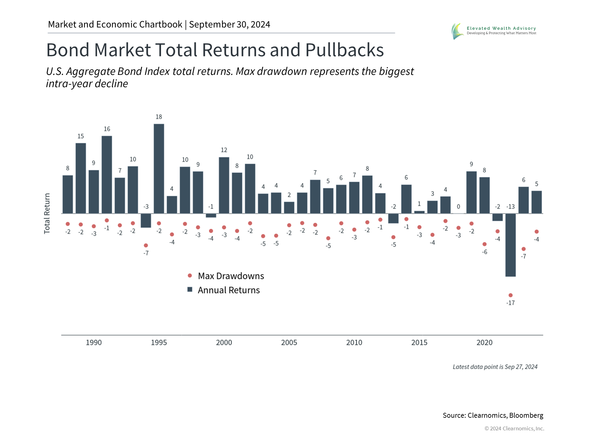 Finally, tensions have risen in the Middle East as the conflict between Israel and Hezbollah has intensified. This adds to global geopolitical tensions including the ongoing war between Russia and Ukraine. While these events have major real-world impacts, their effects on the economy and stock market are less clear cut, and any impact on investors’ portfolios is typically fleeting. As the accompanying chart shows, periods with prolonged market downturns often coincided with major market events such as the dot-com crash or the 2022 rate hikes. One channel through which regional conflicts can impact the broader economy is oil prices. The escalation in the Middle East has caused a slight rise in oil prices, but the increase is modest compared to previous crises, and the U.S.’s position as the world’s largest oil and gas producer may provide some insulation from global events. Despite geopolitical uncertainties, the stock market has experienced only two 5% or worse pullbacks this year, emphasizing the importance of staying invested and focusing on broader market trends rather than reacting to headlines. The bottom line? With the Fed cutting rates, the election on the horizon, and markets near all-time highs, it is more important than ever to stay focused on long-term financial goals rather than short-term events. | |||||