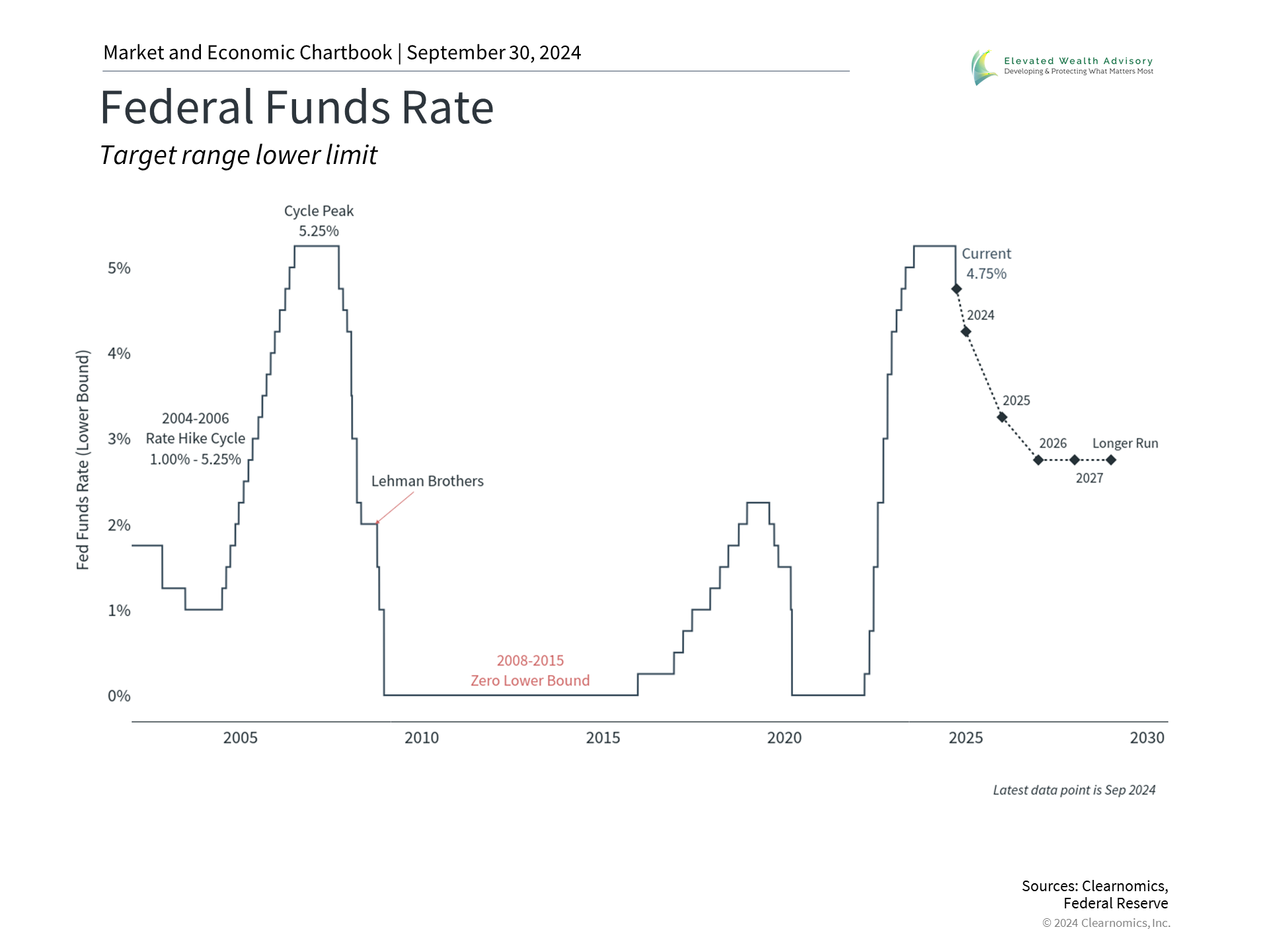 Second, many investors are concerned about the potential impact of the presidential election on the economy. According to polling data from the Pew Research Center, eight out of ten registered voters say the economy is very important to their vote in the presidential election. As the race intensifies, it’s crucial to remember that while elections are important for the country and as citizens, it’s important not to vote with our portfolios and savings. History shows that the stock market has experienced long-term growth under both major political parties, as seen in the accompanying chart. It is not the case that the market or economy crashes when one political party is in office. This is because the underlying drivers of market performance – economic cycles, earnings, valuations, etc. – are far more important than who occupies the White House. That said, policies can certainly affect taxes, trade, industrial policy, regulatory frameworks, and more. However, policy shifts often occur gradually, and their timing and impacts are frequently overestimated. What politicians promise is often different from what is ultimately enacted. Thus, investors should focus on long-term economic and market trends rather than daily poll results. Investors concerned about the impact of specific policies on their financial strategies should work with a trusted advisor. The Fed is expected to cut rates further