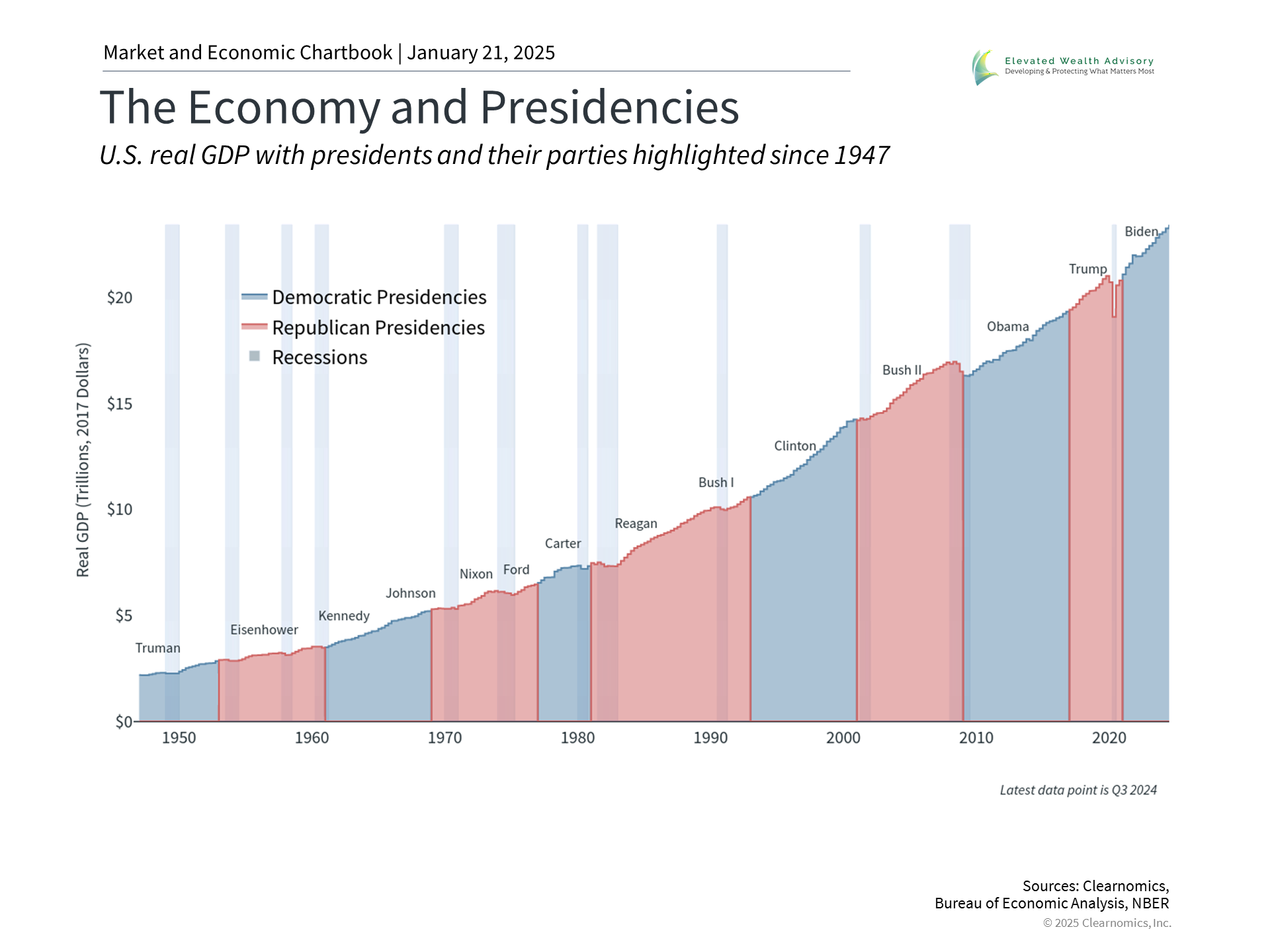 When it comes to markets and the economy, presidents tend to receive too much credit and blame. History shows that economic growth and market rallies have occurred across both parties. This is because who occupies the White House is often less important than the decades-long business and market cycles that happen to be taking place. So, while good policies do matter and can drive productivity and growth, there are many underlying factors that impact investors more than which party happens to be controlling Washington D.C. The bottom line? Over the next four years, investors will be focused on the new administration’s policies and their effects on the economy and markets. For investors, it’s important to put politics aside to stay balanced and focus on long-term goals. 1S&P index total return, as of January 17, 2025. | |||