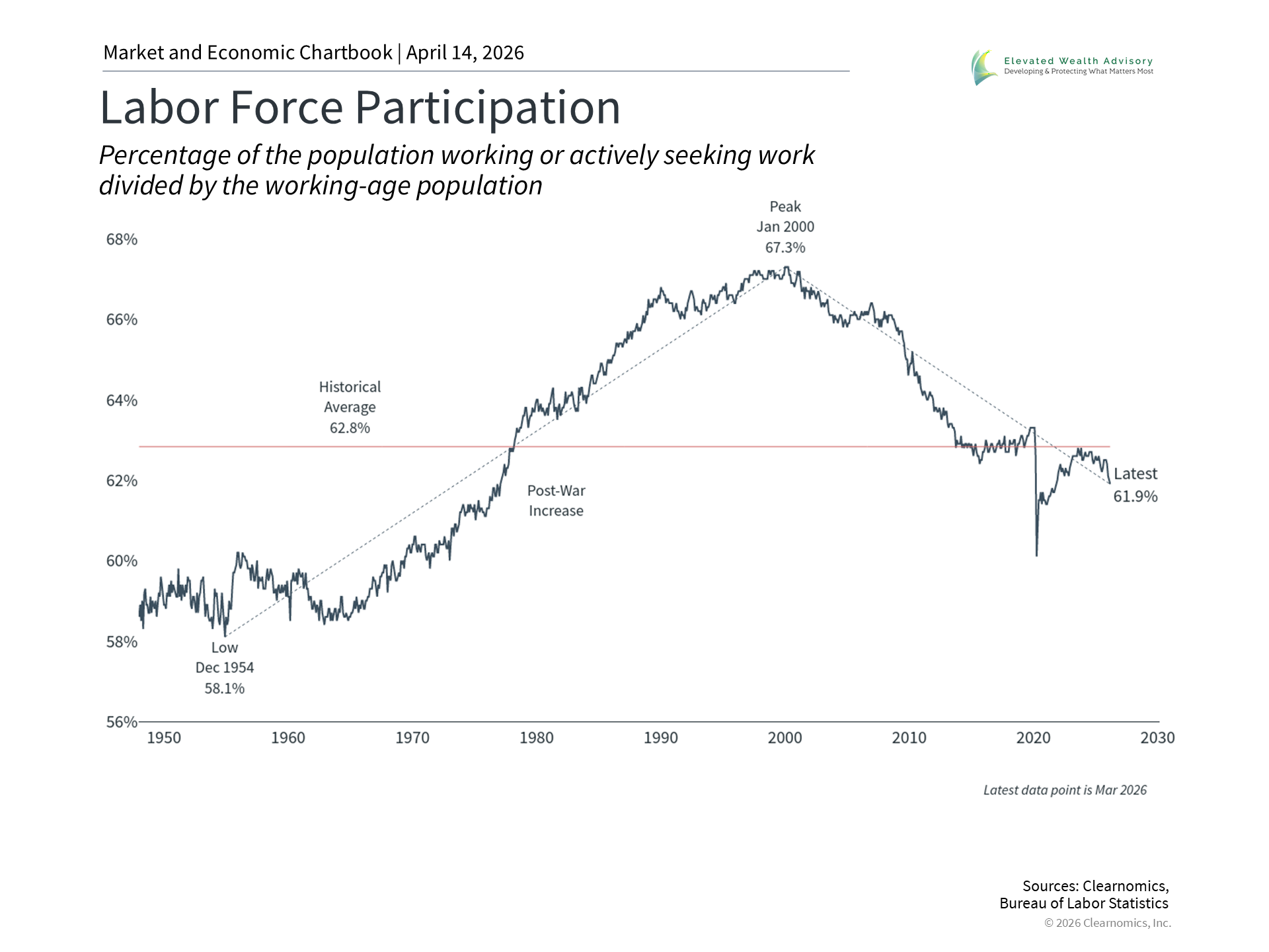 Beyond inflation, the health of the labor market is another important factor for investors to monitor. The latest employment report showed a positive surprise with 178,000 new jobs added in March, a rebound that exceeded expectations of just 65,000. However, the prior month was revised sharply lower to a loss of 133,000 jobs, a reminder that these figures can be noisy and subject to significant revision. Stepping back, the broader trend has been one of slowing job creation. Since the beginning of 2025, the economy has averaged only about 21,000 new jobs per month, a significant deceleration from the 122,000 monthly average in 2024. What’s interesting is that the unemployment rate has not risen significantly. In fact, the unemployment rate edged down only slightly to 4.3% in March, but this reflects a shrinking labor force rather than strong hiring. One important way to understand this is via the labor force participation rate, which measures how many Americans that are of working age are actively working or looking for work. As the accompanying chart shows, this rate has declined to just 61.9%, its lowest level since the pandemic. This is not a new phenomenon since labor force participation has been steadily declining since the early 2000s for demographic reasons, particularly an aging population. For example, over 11,000 baby boomers are reaching retirement age every single day. These demographic trends, along with less immigration, mean that fewer working-age Americans are in the labor force, skewing what economists would have traditionally viewed as a healthy labor market. When fewer people are participating in the job market, the economy requires fewer new jobs each month to maintain low unemployment, which can make the headline figures more difficult to analyze. Within the details of the monthly jobs report, the picture is also uneven. Much of the recent job growth has been concentrated in the “Education and Health Services” sector, while the “Information” sector has experienced job losses, as seen in layoff announcements by large technology companies. Wage growth has also slowed to 3.4% year-over-year, but this pace is still faster than the overall inflation rate for many workers, providing some support for consumer spending. What does all of this mean for investors? Consumers are facing higher costs at a time when the job market is weakening. However, the unemployment rate remains stable, suggesting that those who would like to work are finding jobs. It’s simply the case that there is a smaller fraction of the population actively working today than in the past. Corporate earnings growth remain strong