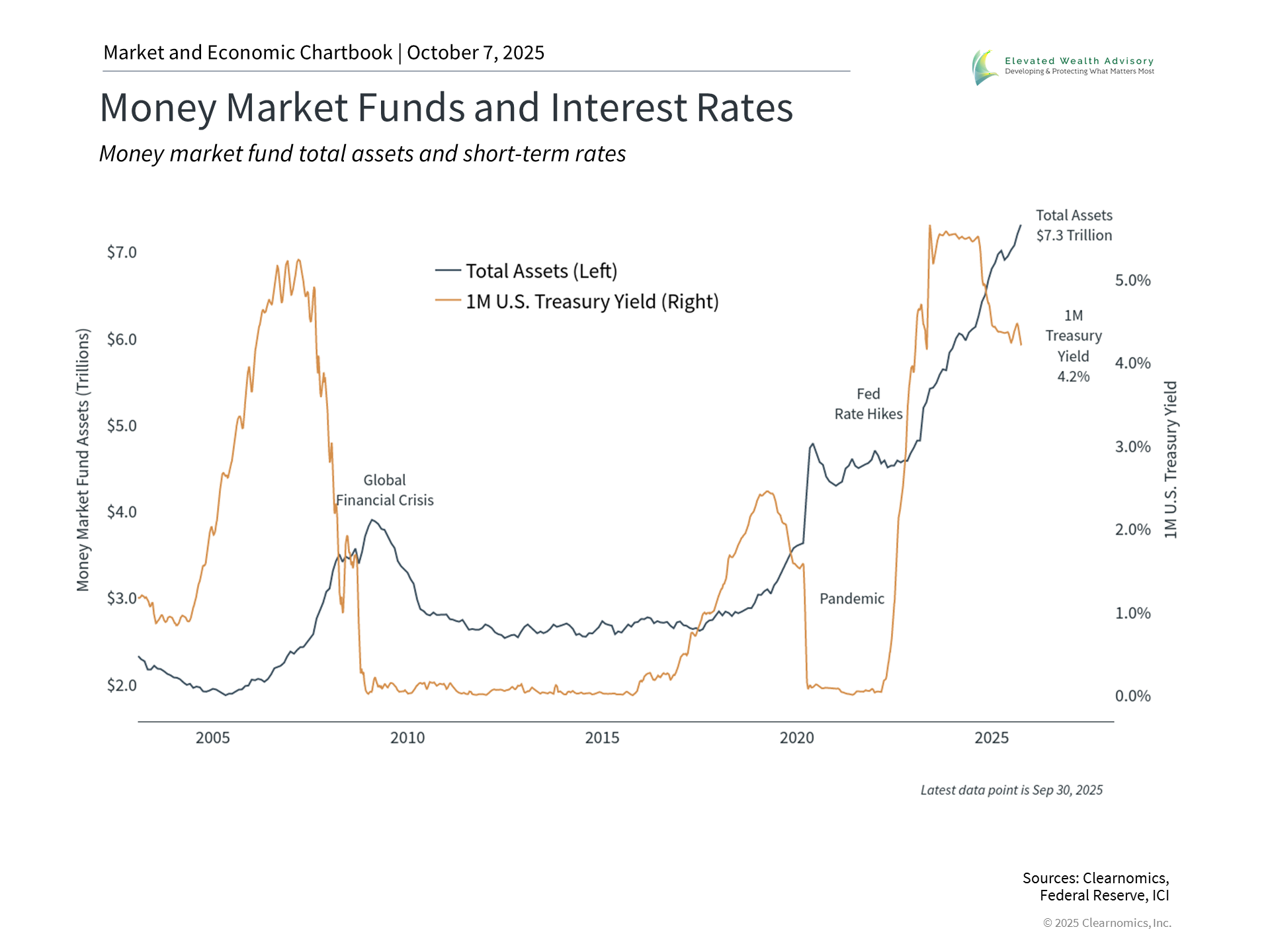Cash isn’t just about our own financial plans, but also speaks to the overall market. As the accompanying chart shows, money market fund assets have reached near-record levels of $7.3 trillion, nearly double the assets held prior to the pandemic. This reflects both investors seeking higher short-term interest rates and a hesitancy to invest in longer-term assets. However, as rates have begun to moderate and are expected to decline further, these excess cash holdings could face reinvestment challenges. Investors who moved significant assets to cash when rates were temporarily high, or during periods of market stress, could face difficult decisions. This is often referred to as “cash on the sidelines,” and reflects the possibility that some investors may move back to stock and bond investments over time. The best approach to handle excess cash will depend on your goals but may include strategies such as dollar-cost averaging. This is important today as the stock market continues to rally and bond yields remain attractive. The interest generated from longer-term Treasury, corporate and high-yield bonds, as well as other fixed income securities, is still attractive compared to history. And while interest rates are difficult to predict, bond market volatility has settled. The same is true for the stock market, which has defied expectations this year. The bottom line? While cash serves important purposes, holding too much creates hidden costs. For long-term investors, maintaining an appropriate cash buffer while staying invested in long-term portfolios is still the best way to achieve financial goals. | |||