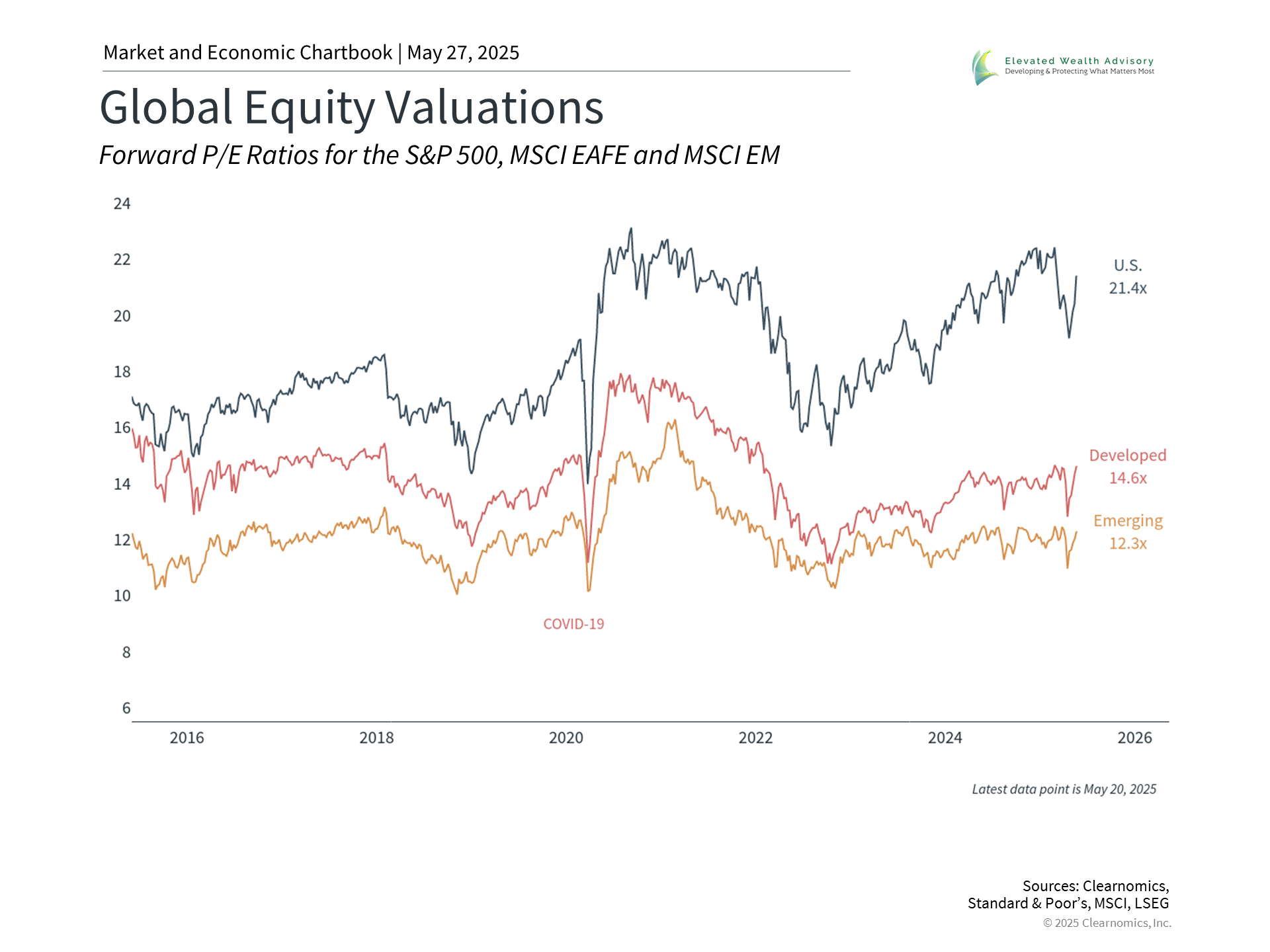 Another area of attractive valuations is international stocks, which are typically categorized into two main segments: developed markets (such as Europe, Japan, and Australia) and emerging markets (including countries like China, India, and Brazil). These classifications reflect differences in economic maturity, market infrastructure, regulatory frameworks, and more. Although U.S. stocks have led global markets for much of the past decade, international stocks have outperformed this year. Specifically, the MSCI EAFE index, which tracks 21 key developed market countries, has gained about 17.5% year-to-date in U.S. dollar terms. The MSCI EM index, which tracks emerging markets, has risen 10%.2 This has occurred despite global uncertainty due to trade. Not only have these markets performed better this year, but valuation differences remain substantial. While the S&P 500 trades at elevated price-to-earnings ratios, international markets offer more attractive valuations, as shown in the chart above. This is partly due to political and economic challenges in many of these regions over the past ten years, some of which have begun to turn around. One key difference between investing in the U.S. and internationally is that currency fluctuations can affect returns. In particular, the weaker dollar has created favorable conditions for U.S.-based investors. This is because foreign assets increase in value when the currencies they are denominated in strengthen, allowing them to be converted back to more dollars. This currency tailwind has been a meaningful contributor to the strong performance of international stocks this year, providing an additional boost beyond the underlying performance of foreign companies. It's important to diversify across regions and market capitalizations