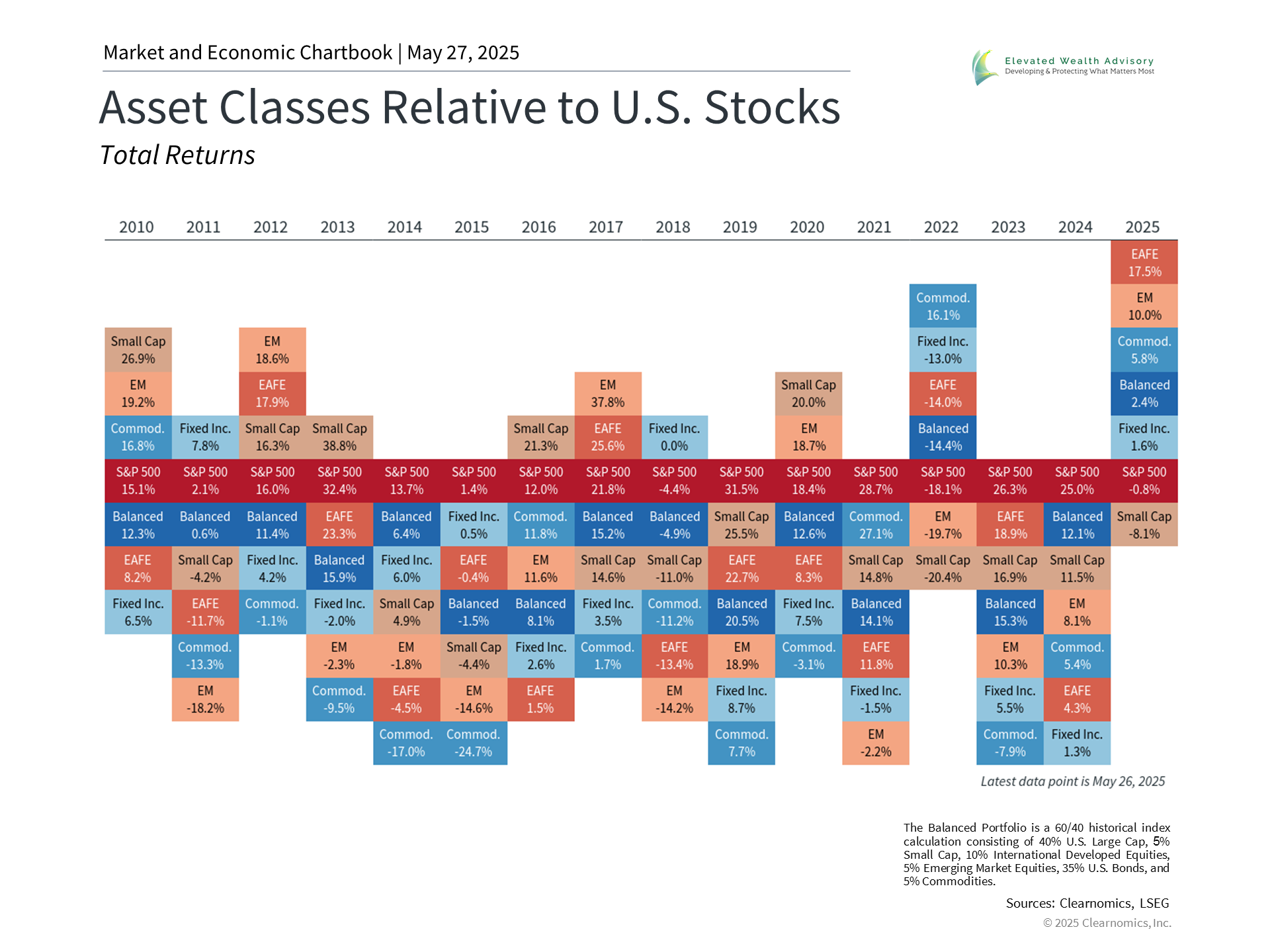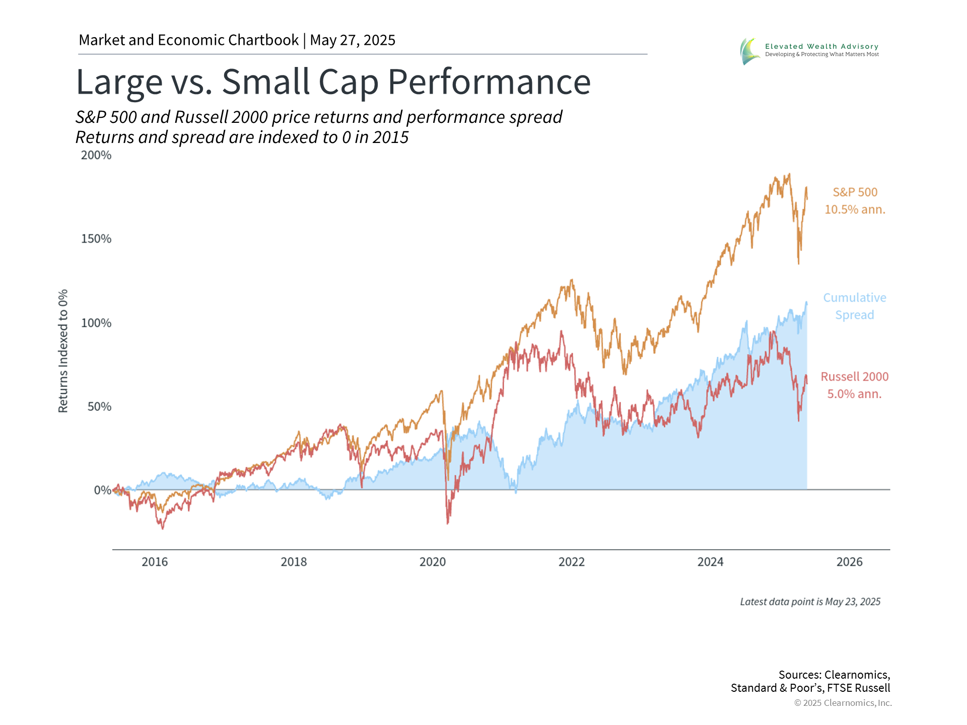 For long-term investors, maintaining exposure to areas such as small-cap and international stocks can help create more balanced portfolios. This is especially true after the significant performance of large-cap stocks which have been driven by just a handful of the largest companies. This is not to say that U.S. large caps will become less important. This is also not an argument for making significant changes to well-constructed portfolios. Instead, maintaining long-term portfolios is all about holding the right asset allocation across all these types of investments. By including more attractively valued parts of the market, we can potentially strengthen long run risk-adjusted outcomes, and take advantage of market opportunities. While any single asset class may underperform during certain periods, their different characteristics and return patterns can provide valuable diversification benefits over time. The bottom line? While the S&P 500 and Dow remain important benchmarks, investors should consider the benefits of diversifying across many other parts of the market, including smaller companies and international stocks. Holding appropriate portfolios for the long run is still the best way to achieve financial success. 1. Russell 2000 and S&P 500, price returns, from January 2, 2015 to May 23, 2025 2. MSCI EAFE and MSCI EM, total returns, January 1, 2025 to May 23, 2025 | |||