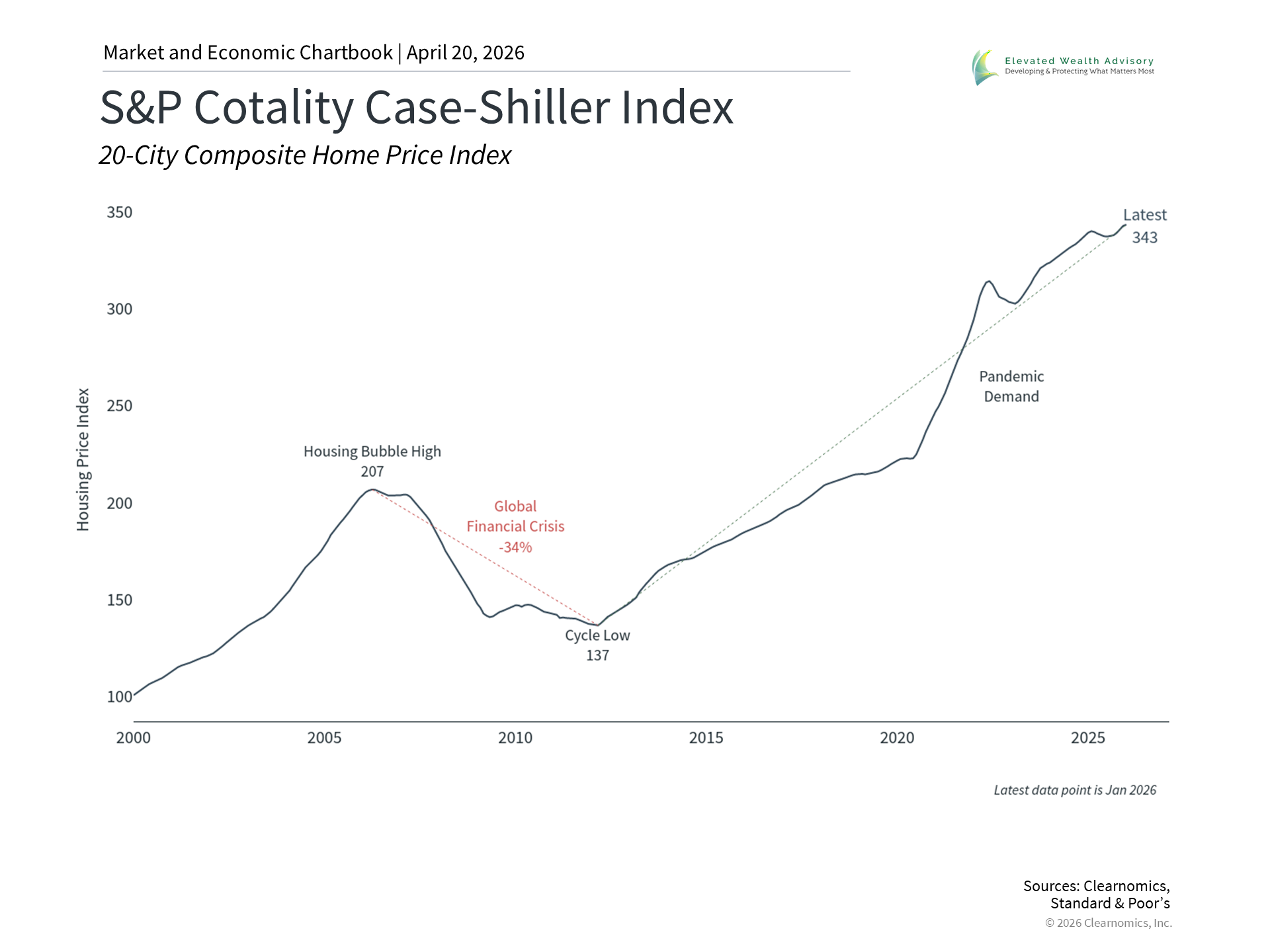 Housing activity has been mixed in recent years across a number of measures. For new buyers, the biggest challenge with affordability is mortgage rates. The 30-year fixed mortgage rate is around 6.3%, well above the lows of 3% or less in 2020 and 2021, and the average of 4.6% since 2008. This means that the monthly cost of purchasing a home is significantly higher than it was just a few years ago, even for buyers with substantial down payments. For those homeowners who were able to lock in mortgage rates near historic lows over the past decade, it can be a difficult decision to sell and give up these rates. This has kept the supply of existing homes limited, leading to a tighter housing market. In March, the sales volume of existing homes fell 3.6%, a reversal to its low one year ago, after climbing earlier this year. In reaction to this, new construction has increased, with housing starts accelerating to 1.5 million units per year in January, but it will take time for this to ease pressure on prices. Even among homebuilders, however, the outlook remains uncertain. The NAHB/Wells Fargo Housing Market Index, which measures sentiment among homebuilders, fell from 38 to 34 in April. From a stock market perspective, the homebuilding subindustry within the S&P 500 index has been roughly flat on the year with a gain of only 0.4%, after several years of mixed performance. Despite these challenges with housing activity, home prices are still near record levels across the country. The S&P Cotality Case-Shiller indices, which measure prices nationally and across the largest U.S. cities, have climbed steadily. Across the country, home prices have experienced significant declines in only two periods in recent history: the 2008 housing bust and the brief pullback that followed the rapid rise in inflation beginning in 2022. Higher home prices mean that, from a macroeconomic perspective, balance sheets for homeowners have generally remained healthy. This has been further supported by a low unemployment rate and strong wage gains, and are important reasons that overall consumer spending has held up better than many feared. These factors have helped to offset poor consumer sentiment driven by inflation and job losses in certain sectors, such as in tech. Housing is often the foundation of wealth across generations