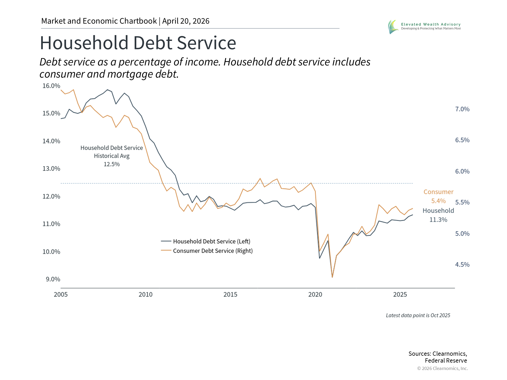 Of course, housing is not only the largest asset on most household balance sheets, but also the largest source of debt. The accompanying chart shows both household debt, which includes mortgages, and consumer debt, which does not. Even as other forms of debt rise, including credit cards and student loans, mortgage debt represents by far the largest component of total household borrowing. One encouraging aspect of today’s environment is that debt service levels (the size of debt payments relative to household income) are still moderate relative to history. Mortgage underwriting standards have also been considerably more conservative since the 2008 financial crisis, when household debt levels were far higher. Still, the burden of these debt payments is a real consideration for many households, particularly those who purchased homes in recent years at higher prices and interest rates. So, from an economic perspective, healthy home prices could continue to support consumer balance sheets and the broader economy despite mixed activity. From a financial planning perspective, it’s important for investors to have a clear understanding of their full financial picture. While headlines have focused on stock market swings and the Middle East conflict, the truth is that focusing on aspects of our financial plans closer to home may play a much larger role in achieving long-term goals. The bottom line? The housing market remains a core part of both household finances and the broader economy. With ongoing market volatility, understanding the key drivers of household wealth can help investors maintain perspective and stay focused on their long-term financial plans. | |||