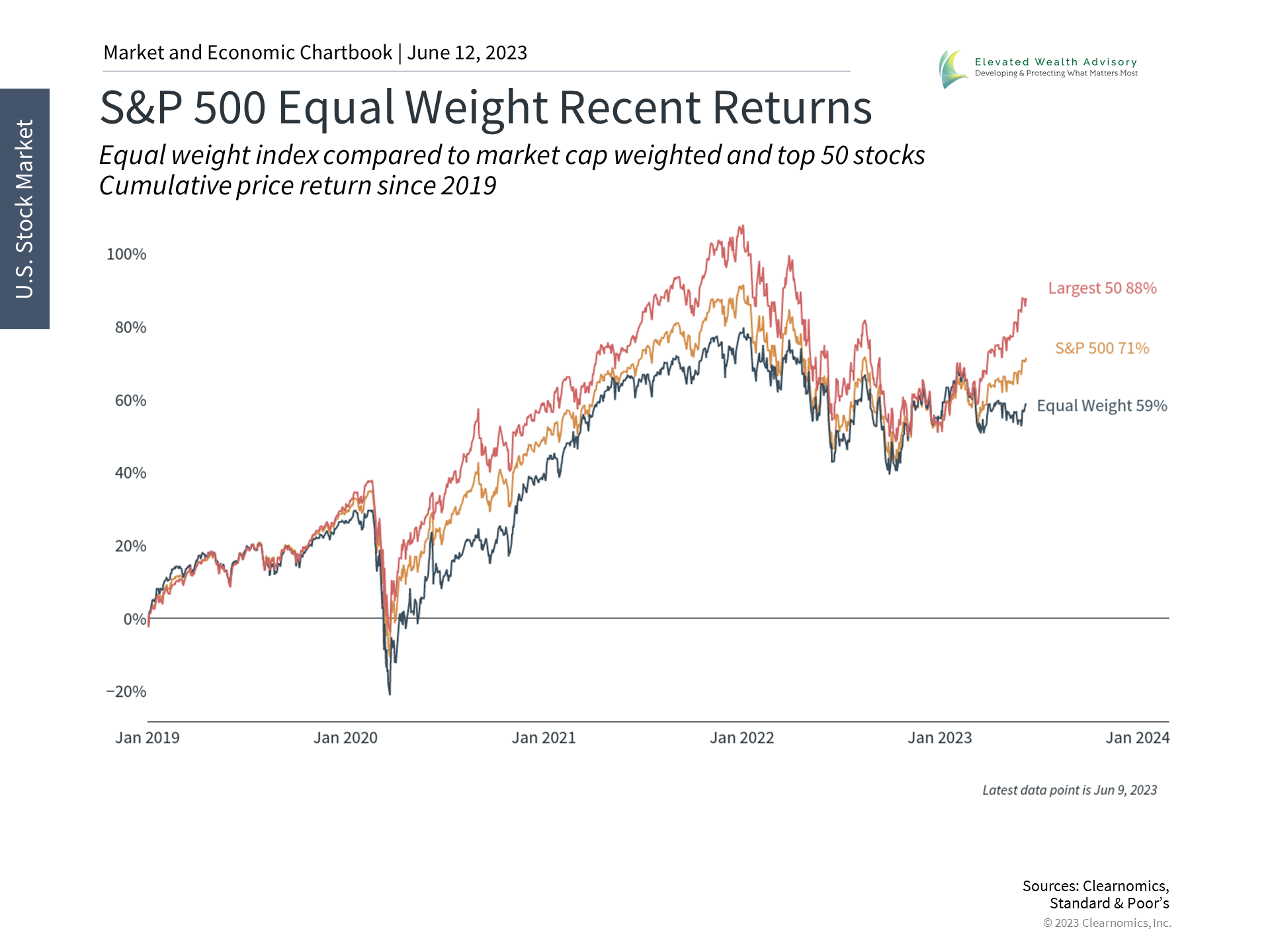 From a market perspective, enthusiasm for AI has boosted tech-related sectors and benefited diversified investors. While the S&P 500 has gained 12% this year, the information technology and communication services sectors have climbed 35% and 33%, respectively. Macroeconomic factors such as a possible Fed pause, improving inflation, and steady economic growth have boosted these sectors as well. These returns have more than offset the poor performances of sectors such as energy and financials, and have overshadowed problems in the banking and commercial real estate industries. One concern with this dynamic is that a small number of stocks have generated most of the returns this year. This is often referred to as narrow market leadership or limited market breadth. Indeed, the largest 50 stocks in the S&P 500 have generated an outsized proportion of the returns this year, far outpacing a broader equal-weighted index. Unfortunately, this has been the trend over the past decade as mega caps have played an ever-growing role in market performance. This is due to economies of scale related to large technology companies which have pushed many market caps to the trillion-dollar level and beyond. While there is a debate around whether this is good or bad for markets, the reality is that this is not something investors can control. What they can control is whether they are diversified across all of these sectors. Those that have appropriate portfolio exposures have benefited from these trends, just as they benefited from strong energy returns last year, while also staying prudent as valuations rise to higher and higher levels. These dynamics are further evidence that it is difficult to predict what will outperform in any given year, and thus it remains important to be properly diversified. The bottom line? Investors should maintain a level head around new technologies such as artificial intelligence. Greater productivity growth and strong sector returns are a reason for investors to stay diversified and focused on the long run. | |||