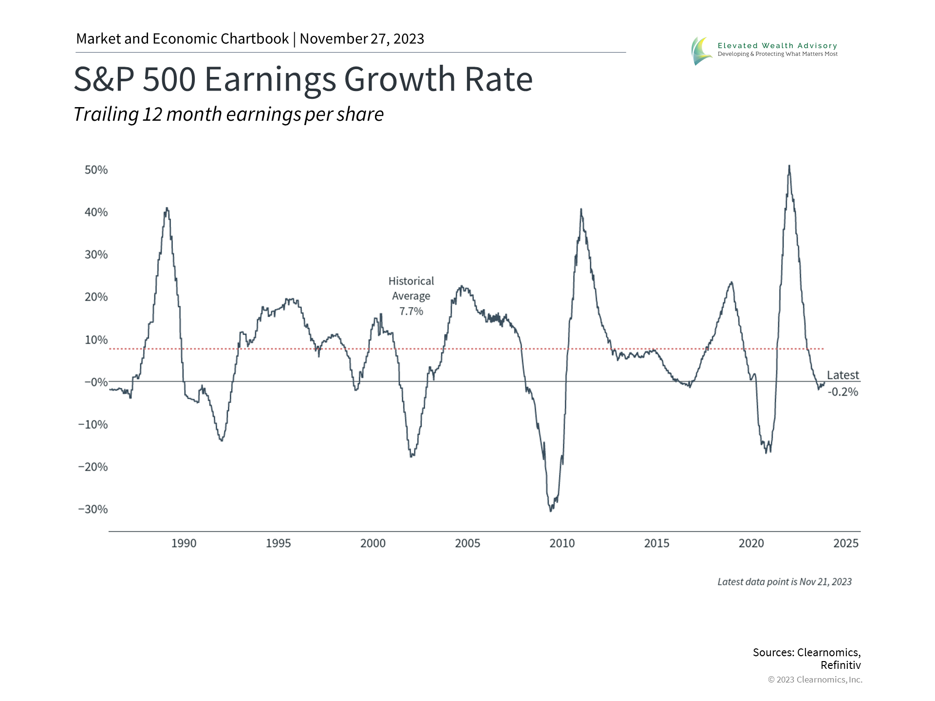 The third quarter earnings season is wrapping up with 94% of S&P 500 companies reporting their results. According to FactSet, 82% of these companies have had positive earnings surprises, yielding an expected year-over-year earnings-per-share growth rate of 4.3%. This is likely to be the first quarter of positive growth in a year, a notable inflection point that mirrors the surprising stability of the underlying economy. Consensus Wall Street estimates are for earnings to be flat this year at about $217 per share but to then rebound in 2024 by 11%. While this is somewhat at odds with economic forecasts for slowing growth in the coming quarters, it's safe to say that any acceleration in earnings would be welcomed by investors. As the accompanying chart shows, the growth of corporate profits has been slowing since its peak in 2021, but may have reached a turning point. Historically, large public companies have increased their earnings by an average of 7.7% per year, but this fluctuates alongside the business cycle. To oversimplify the earnings cycle, in good times companies increase their sales faster than their expenses, boosting profits and margins. In bad times, companies experience slowing revenues and cut costs to maintain margins. Better cost structures then allow companies to be more profitable once the economy turns around. It may seem obvious that profits matter and that, over long time frames, they should reflect the value created by companies. Business owners, executives, and corporate boards have strong incentives to maintain and boost profitability and thus shareholder returns. When it comes to investing, there are three specific reasons why this matters to investors. The stock market tends to follow corporate earnings