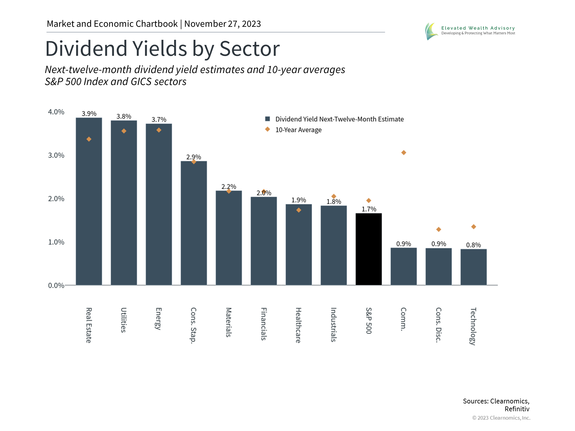 Third, profits support dividend payments. From a corporation's perspective, dividends are a way to return cash to shareholders. In theory, if a corporation has no attractive investment opportunities, it makes sense to return cash to shareholders who can invest it themselves. In general, however, corporations pay steady dividends in order to attract investors, especially if they can grow these payments over time. Additionally, some companies have been holding on to more and more cash and some sectors pay relatively low dividends, especially across technology-related companies. For investors, dividends are an integral part of total returns. Historically, dividends - and not price appreciation - were one of the primary reasons for investing. Today, everyday investors seem to focus mostly on stock prices except in cases where portfolio income is needed, such as for those nearing or in retirement. While bond yields have risen this year and the market has been volatile, the accompanying chart shows that many sectors still have very attractive dividend yields. Not surprisingly, sectors that have underperformed this year, including Real Estate, Utilities, and Energy, can generate yields just under 4%. Sectors that have seen the most price appreciation, namely Communication Services, Consumer Discretionary, and Information Technology, also have the lowest yields. Thus, investors should not focus exclusively on recent performance or dividend yields. Instead, it's important to diversify across sectors in order to benefit from all phases of the market cycle, especially if earnings do continue to turn around. The bottom line? Economic growth drives corporate earnings which in turn support the stock market. Investors should follow these longer-term trends, rather than day-to-day market movements, as they work toward their financial goals. | |||