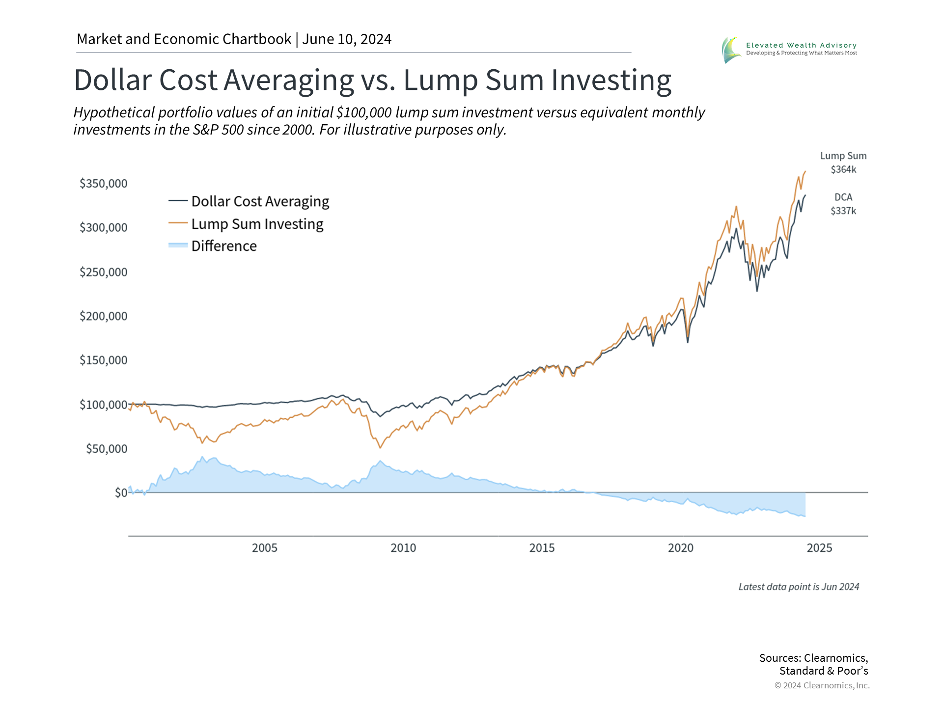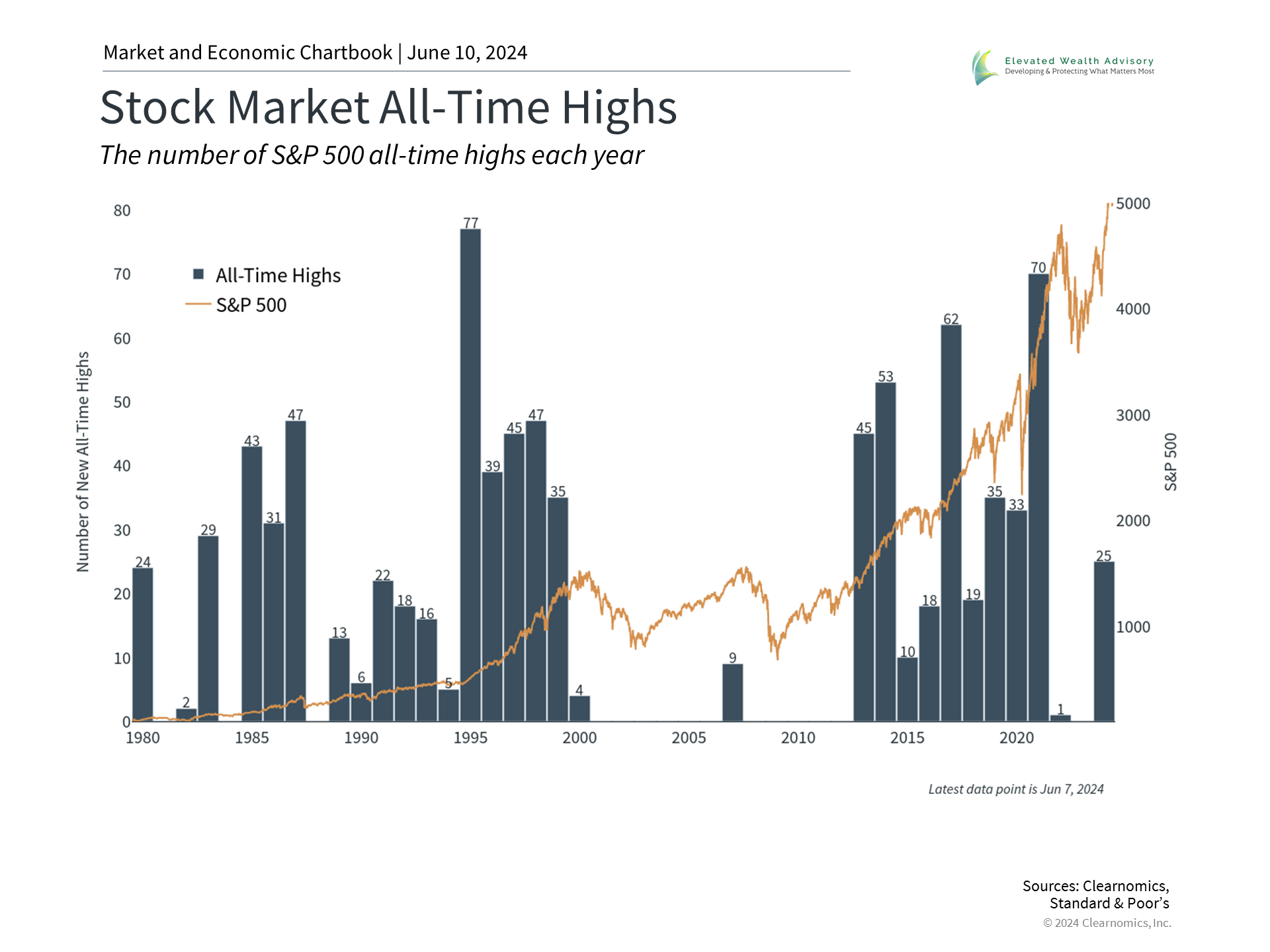 The takeaway here is less about how to maximize returns than how to stay invested through years and decades. Dollar-cost averaging can help reduce risk in situations where markets fall sharply, especially early on. However, lump sum investing tends to outperform dollar-cost averaging in the long run since, historically, markets have steadily risen over time. This is analogous to comparing a 100% stock portfolio to a properly diversified one that holds a balanced mix of stocks, bonds, and other asset classes. The 100% stock portfolio might outperform over long periods, especially during strong bull markets like today’s, but it will also experience sharper pullbacks. The diversified portfolio, on the other hand, will experience steadier growth and more muted declines, making it easier for investors to stay level headed. This is especially relevant today with the market near all-time highs. The truth of the matter is that markets are always uncertain. Whether it’s the upcoming presidential election, geopolitical conflict, or the direction of interest rates and the economy, investors may worry that the market could pull back just after they invest. It’s important to keep in mind that just because the market is near a current peak doesn’t necessarily mean it’s “due for a pullback.” By definition, markets achieve many new all-time highs as they rise during bull markets. While there has been significant uncertainty this year due to interest rates, inflation, and the Fed, the S&P 500 has already experienced 24 new all-time highs. This includes a sharp rally in May after a slump in April. Ironically, it can be psychologically difficult to invest both when the market is rising and when it is falling, for fear that the market might be at its peak in the first case, and that it might fall further in the second. So, whether dollar-cost averaging or lump sum investing makes more sense depends on the individual investor, their ability to handle risk, and their time horizon. Getting invested sooner is better than waiting for the right timing