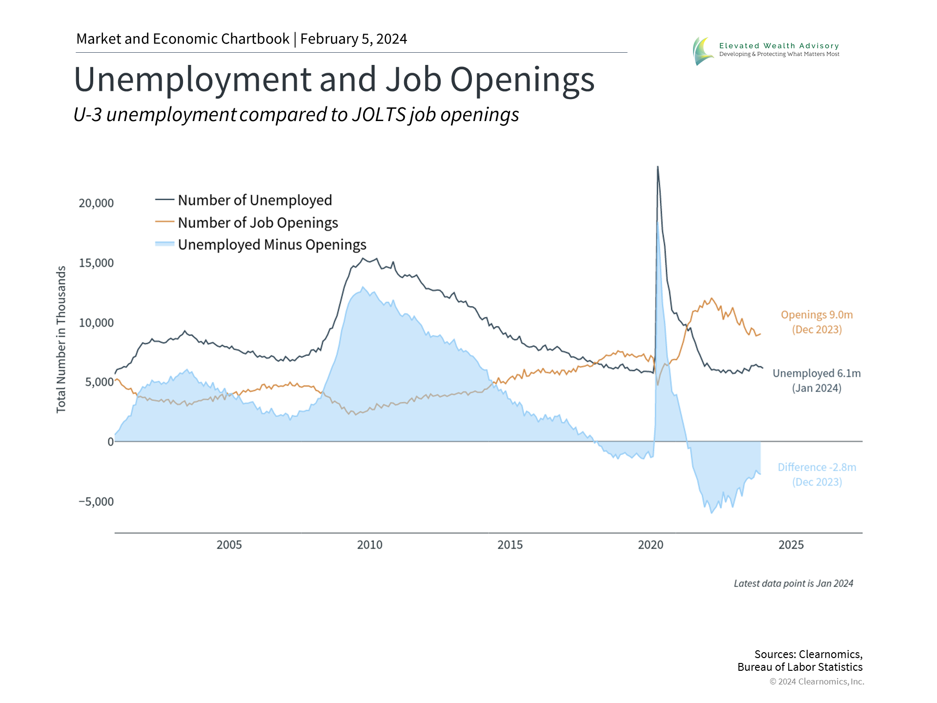 In contrast to many of these investor concerns, there are many signs that the economy is fundamentally strong. The latest jobs report showed that 353,000 new jobs were created in January, far more than the 185,000 economists expected. December payrolls were also revised up sharply to 333,000, bringing the average monthly gain over the past year to 244,000, a very healthy pace. The unemployment rate remains at 3.7%, one of the lowest in history. The accompanying chart shows that while job openings have declined as the Fed has raised rates, there are still nearly 1.5 job openings per unemployed person across the country. This is the case despite layoff announcements from large companies as they attempt to reduce costs and maintain profit margins. Many of these layoffs are a reversal of the rapid hiring that occurred during and after the pandemic, especially among large technology companies such as Alphabet, Microsoft, PayPal and many others. While these layoffs clearly have an impact on individuals and households, perspective is needed when considering the effects on the economy and markets. The jobs data show that while the Information sector gained "only" 15,000 jobs last month, sectors such as Professional and Business Services, Health Care, and Retail Trade added 74,000, 70,000, and 45,000, respectively. Despite recent market swings, volatility remains subdued