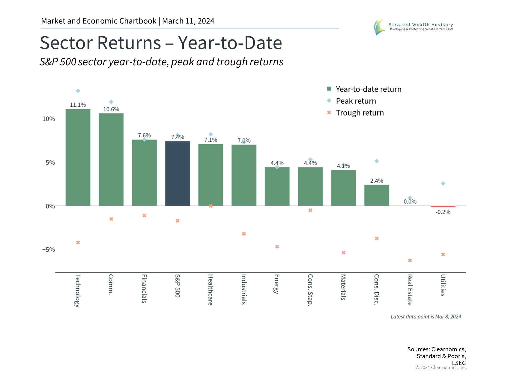 Like gold, Bitcoin has also rallied sharply in recent weeks. This is not just due to the possibility of Fed rate cuts, which should theoretically benefit cryptocurrencies and other stores of value, but is also related to the approval of spot Bitcoin ETFs in January. According to news reports, tens of billions in new funds have flowed into these ETFs which provide a simpler and more attractive way to invest in digital assets compared to Bitcoin futures or holding a digital wallet. On a technical basis, Bitcoin will also experience a "halving" around April during which the reward for mining will be cut in half. Some investors believe this might help to boost the price of Bitcoin as new supply becomes increasingly scarce. Whether the rallies in Bitcoin and other cryptocurrencies continue is unclear given the uncertain nature of the asset class, especially after the various corporate collapses, scams, and criminal convictions in the ecosystem over the past few years. Still, the rapid recovery from the 2022 crash has no doubt attracted much investor attention. Similar to gold, long-term investors should view digital assets from the perspective of properly diversified portfolios. Unfortunately, cryptocurrencies have not yet proven to be reliable portfolio diversifiers since they are strongly correlated with the stock market and other risk assets, serving to amplify risk. It's no secret that Bitcoin is extremely volatile and price swings have been 5 to 10 times larger than the overall stock market. So, Bitcoin can be thought of as another asset with specific characteristics. The question of whether and how much to invest in this asset should be no different than deciding on any stock, bond, currency, commodity, real estate property, etc. Careful analysis and risk management are needed to understand the potential risks and expected returns relative to other investments. Many sectors have contributed to S&P 500 returns this year