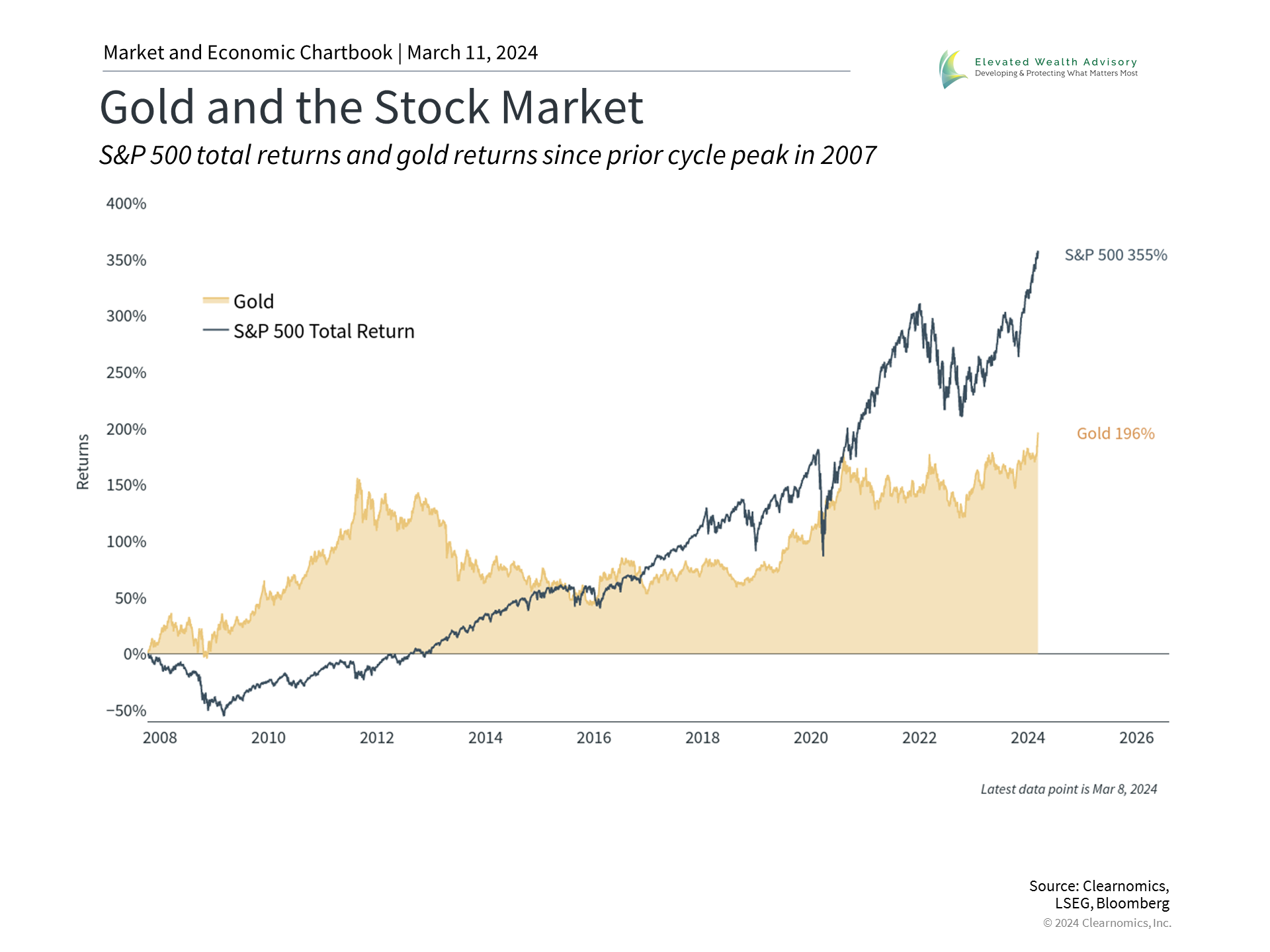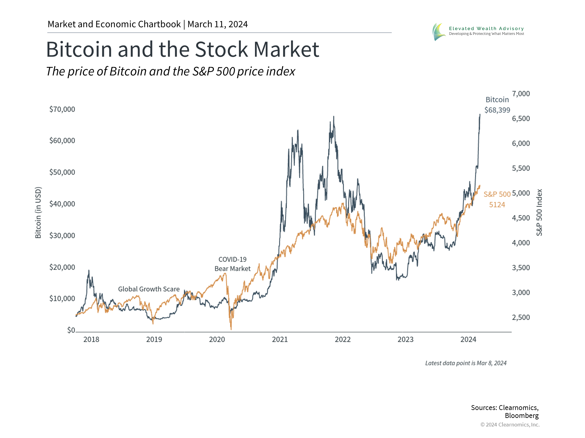 In times like these, it's important for long-term investors to stay diversified and not lose sight of the bigger picture. True financial success is not about timing the market perfectly or going "all-in" on a single investment. Instead, it’s about building and maintaining a portfolio tailored to financial objectives that can perform well across all phases of the market cycle. At the moment, the market believes it's a matter of when, not if, the Fed will begin its first rate cut cycle since 2019. The underlying economic trends are in favor of lower rates but recent economic data have sent mixed signals as to the exact timing. For example, the latest report from the Bureau of Labor Statistics showed that 275,000 new jobs were added in February, well above what economists expected. A strong job market means that the Fed can hold off on cutting rates, since it suggests the economy is doing fine even with tight financial conditions. However, the same report also showed that the prior two months' job numbers were 167,000 lower than originally believed, while unemployment also ticked up to 3.9%. This muddies the picture, leading many investors to adjust their expectations in favor of a first rate cut in June or July. In theory, gold can benefit from rate cuts just as the stock market does. Lower interest rates make bonds and cash relatively less attractive, leading investors to seek alternative ways to preserve wealth. This is especially true when investors are worried about the country's fiscal discipline and geopolitical risks in the Middle East and Ukraine. The accompanying chart shows that gold has gained about 35% since its lowest point in 2022 when the Fed was hiking rates rapidly. Interestingly, the S&P 500 has outperformed gold over this period with a gain of 44% with reinvested dividends. This is partly because gold does not always behave as one might expect or hope. In times of high inflation and economic distress, hard assets such as gold and other commodities are expected to outperform. While gold did rally in early 2022 when inflation was accelerating, gold prices then pulled back and did not recover until the middle of 2023. Gold also provides no income benefits which makes it less attractive if interest rates remain higher for longer. Thus, while gold has experienced a strong rally and is hovering near all-time highs, it's important to keep its relative performance in perspective. The choppiness of gold prices over the past few years shows that while it can act as both a hedge during inflationary periods and serve as a store of value, this can reverse quickly as conditions change. Like all asset classes, gold is perhaps most valuable as part of a diversified portfolio rather than as a standalone investment. Bitcoin has jumped sharply for fundamental and technical reasons