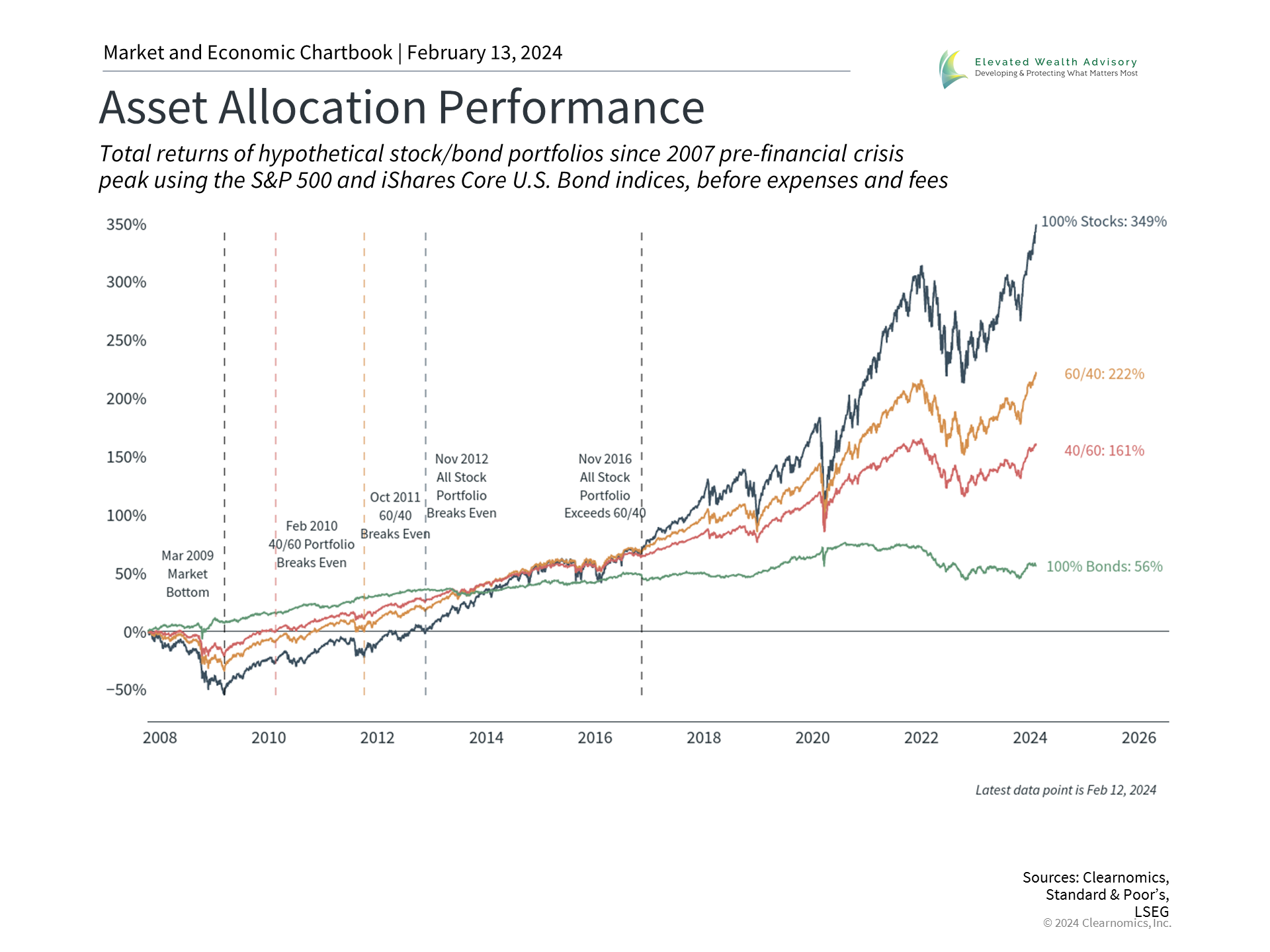 Second, one of the most important ideas in behavioral finance is known as "loss aversion," the idea that losses tend to feel worse to investors than similar gains. A simple example is that finding twenty dollars on the ground will certainly make you happy but accidentally losing a twenty-dollar bill - or having it stolen from you - will likely make you more upset. This asymmetry in how we experience gains and losses grows as the amount increases. In the extreme, large portfolio gains may make investors quite happy for a short time but large losses may lead investors to give up on their financial plans altogether. While most investors would like to generate significant portfolio gains year in and year out, the reality is that markets are inherently volatile. This is why, from a long-term perspective, it is far more important for investors to build a portfolio and financial plan that they can stick with through good and bad times, rather than a portfolio with the best theoretical returns. The accompanying chart shows four different asset allocation portfolios and highlights how different their paths have been since the 2008 financial crisis. Clearly, an all-stock portfolio would have performed best over the past 15 years. However, there are few investors who can stomach losses on the order of 50% over the course of years. Thus, most investors would have been better served holding a diversified portfolio instead. Not only would their returns have been quite strong over this period, but they would have been more likely to stick to their financial goals despite the many challenges along the way. How investors react to bull and bear markets can have long-term consequences