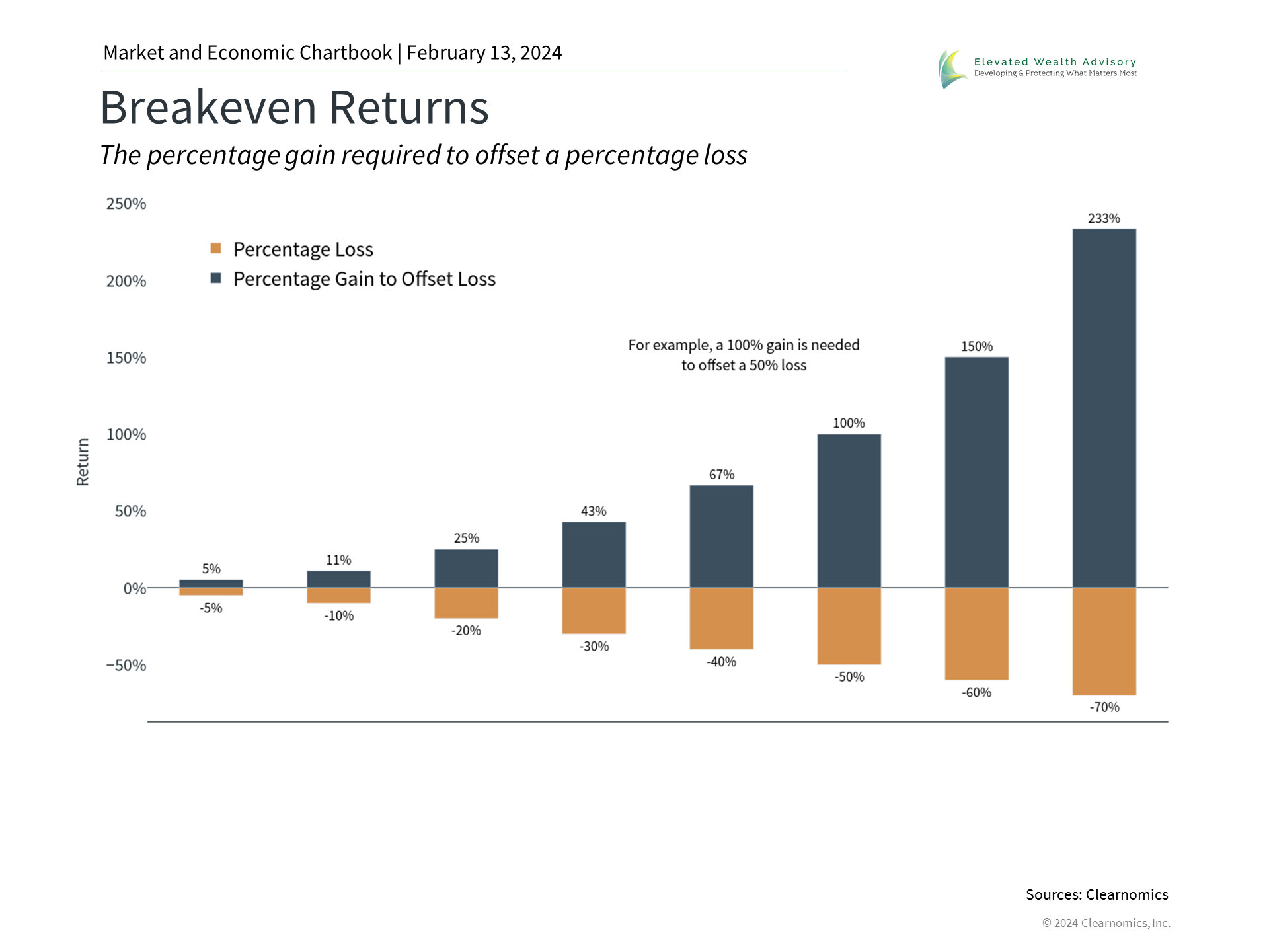 The S&P 500 index recently closed above 5,000 and set a new all-time high, less than three years after it first crossed the 4,000 mark. While some are understandably nervous any time the market is near record levels, investors also tend to grow more bullish as the momentum continues. Across market cycles, fear often turns to caution, giving way to optimism and eventually irrational exuberance. With the market's rapid climb over the past year, what should investors keep in mind to stay disciplined and focused on their financial plans? Much larger percentage gains are needed to offset losses