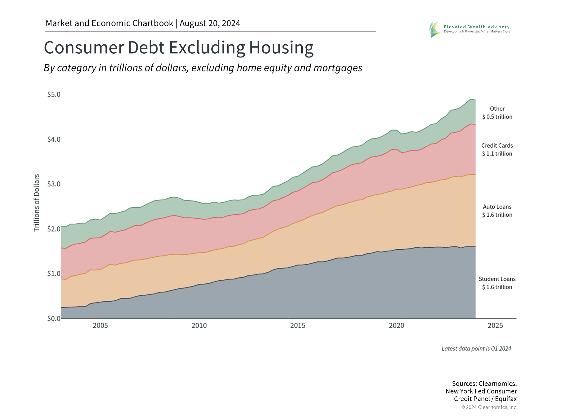 As the candidates’ policy platforms continue to unfold, especially with the Democratic National Convention taking place, understanding this bigger-picture context is important. This is not to say that economic policies do not matter, just that investors should not overreact to the results of any individual election or a specific policy. In fact, it’s often the economy that impacts elections, and not the other way around. This is especially true because the two candidates’ platforms are naturally backward-looking, focusing on what households have experienced over the past few years. For instance, according to a recent poll by The Economist/YouGov, 24% of Americans rank “inflation/prices” as the most important issue, followed by “jobs and the economy” at 13%. This is not surprising given recent market and economic swings due to inflation, interest rates, and Fed policy. Even though inflation pressures have eased significantly and the economy is strong by many measures, very few consumers feel confident in the economy or their financial situations. This is largely because consumer debt has risen dramatically, as shown in the chart above. Total non-mortgage consumer debt has more than doubled in the last 20 years across Democratic and Republican presidencies. Credit card debt is at record levels while student loan and auto loan balances are increasing at their fastest rates since 2003. This is why President Trump and Vice President Harris have both built their economic platforms around consumers. Despite the many social differences between the two candidates, there are broad similarities between their economic proposals. Both focus on the cost of living across grocery bills - including the cost of bacon, bread, and ground beef - prescription medication, and housing. In recent weeks, both candidates have also agreed on expanding child tax credits and not taxing tips. Politically, it makes sense that both candidates are speaking to those who feel “left behind” given the economic turmoil of the past few years. Coprate Taxes and the Deficit