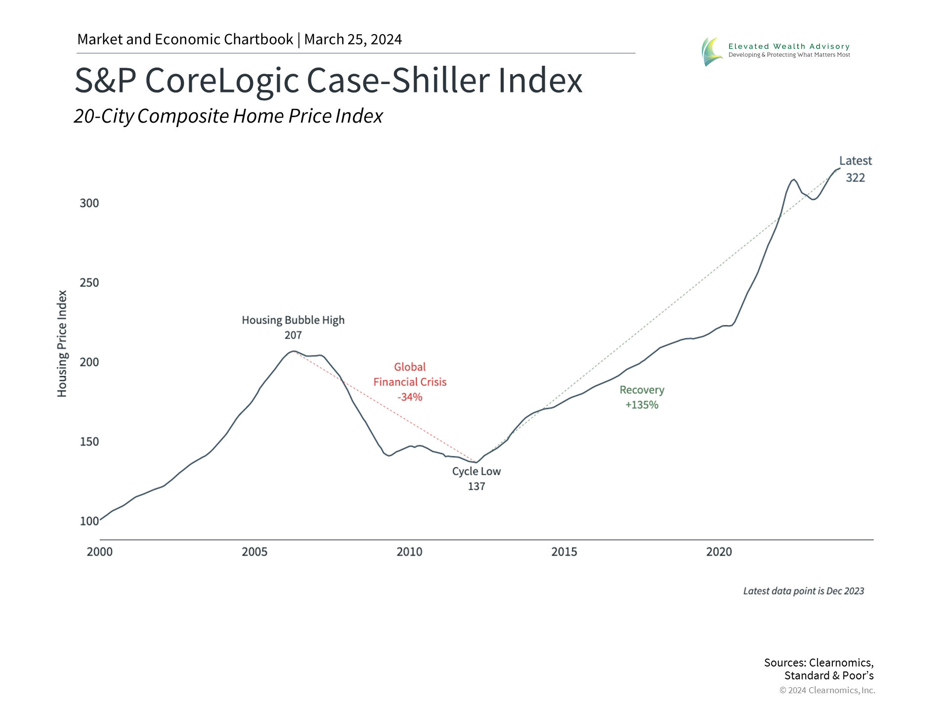 With major stock market indices hovering around all-time highs, some investors continue to worry about the state of the economy. While trends around inflation and jobs have been positive, putting the Fed in a position to cut rates later this year, there are still many concerns in areas such as real estate. This is because real estate is not just another asset class but a large sector of the economy that impacts consumer net worth, inflation, financial stability and more. What do long-term investors need to know about stresses in the real estate market? Housing prices are at record levels
