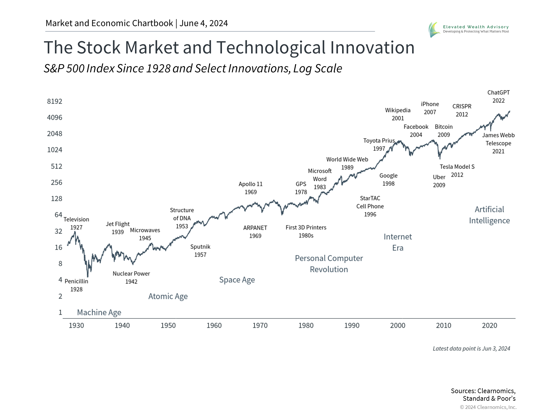 It’s understandable that investors often focus on the financing side of markets and the economy, including topics such as interest rates and Fed policy. Projects in the real world need funding so the purpose of the financial system is to direct capital toward its highest-value use. In doing so, investors hope to generate positive returns that grow their capital and be deployed to new activities. When done well, this can create a virtuous cycle that leads to long run economic growth. The key, however, is for these investments and their returns to correspond to true innovation. As the accompanying chart shows, the past century has been one of unceasing technological advancement from the first assembly lines to putting a man on the moon, to the entire world being connected on a single information network. In fact, the modern era is driven by the idea that technology should improve every year, whether it’s our cell phones, computers, cars or thermostats. In turn, the services they enable should also improve the quality of our lives, including ordering food delivery, watching movies on demand, communicating with friends and family, better medical care, and making investment decisions. Of course, this does not always play out as expected, such as with concerns over social media. What makes the information age unlike previous periods in history? Unlike physical objects such as buildings, machines on factory floors, or hardcover books, one person's use of a digital service doesn't prevent another from using it. This is important because digital tools allow knowledge workers to be more productive in a scalable way, creating benefits across a variety of industries and scientific fields. Knowledge workers are also expensive and time-consuming to train, so even small gains in productivity can compound over time. These are all reasons why many believe that AI is the pinnacle of the information age. Today's optimism on AI stems from the idea that it could enable even more technological innovations and accelerate productivity further. So far, examples of AI-boosted productivity in the business world have mainly been in the form of generating content, automating tasks, and analyzing data. It's hard to predict exactly what impact AI will eventually have, partly due to the pace of advancement, and partly because the impact of new technologies is simply hard to imagine. What's clear from the chart above is that the stock market did not move up in a straight line with past innovations, and many of their effects took years to materialize. AI stocks have outperformed but other sectors are benefiting too