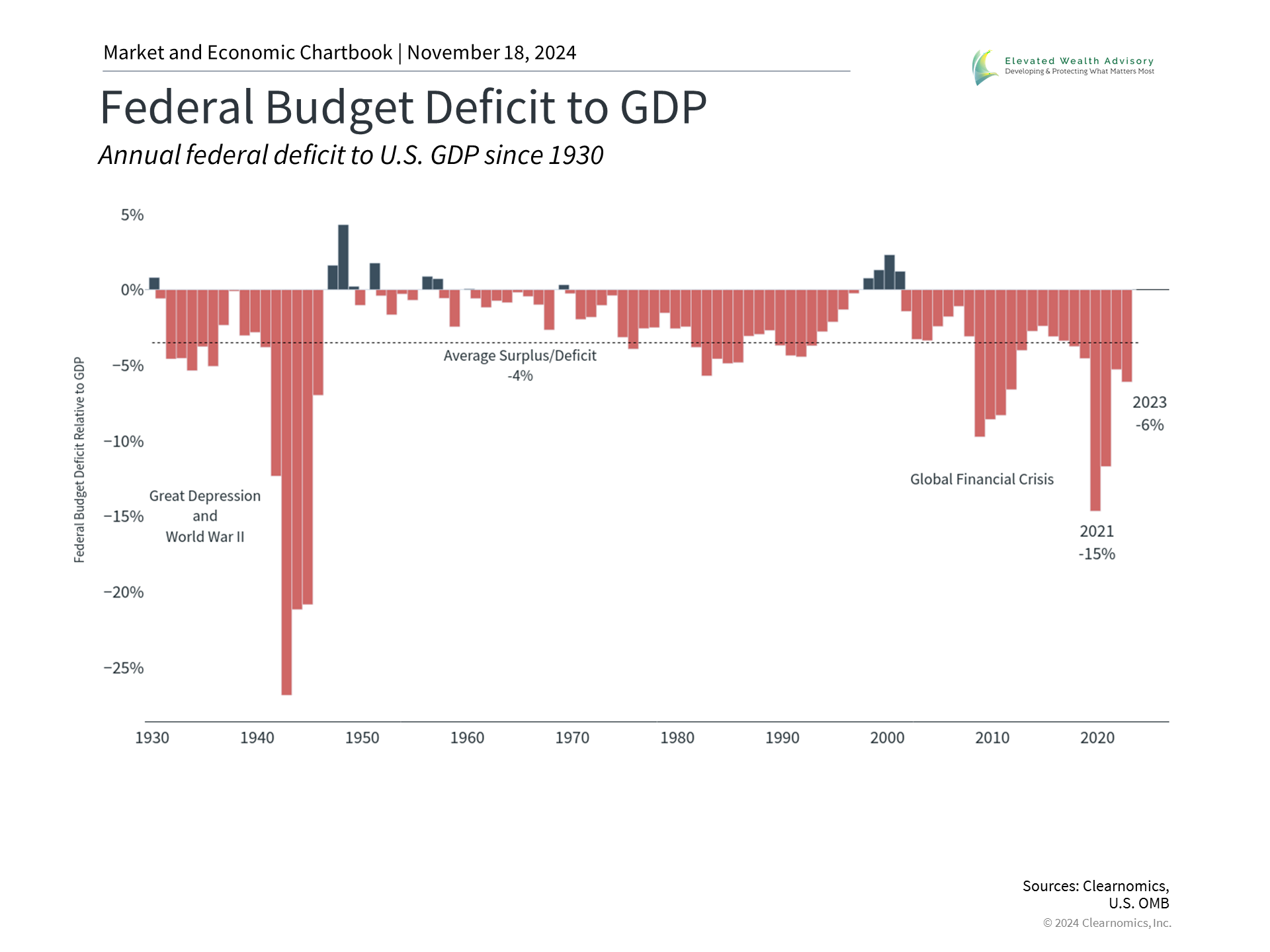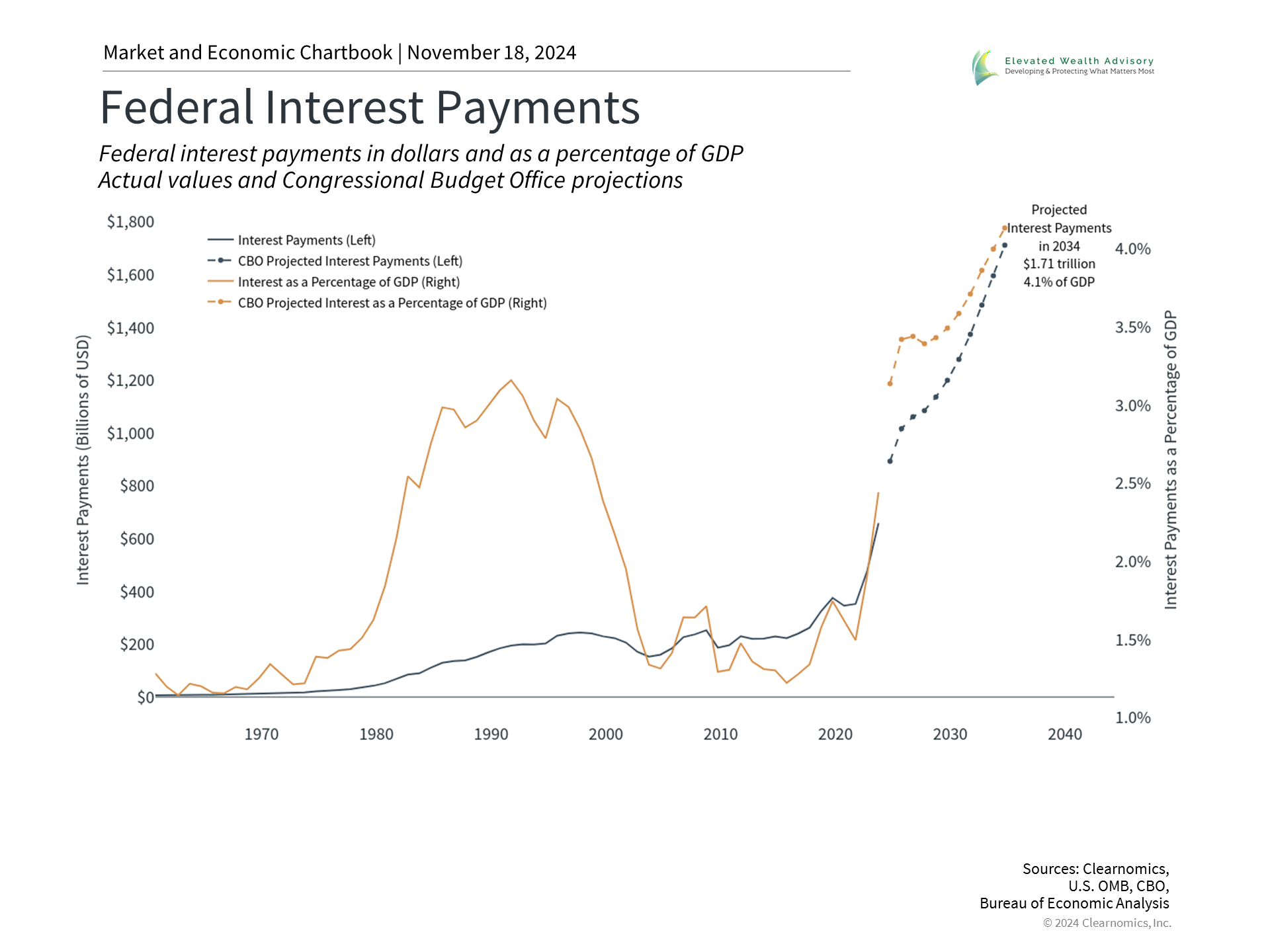 The unfortunate reality is that deficit spending does not seem to be going away, with neither major party focusing on the issue. The last balanced budgets occurred during the Clinton years and the Nixon administration before that. The accompanying chart shows that left unchecked, government projections suggest that interest payments on the debt alone could rise to $1.71 trillion in ten years. About two-thirds of the national debt is held either by the government itself or by U.S. citizens. Other countries hold the rest with China owning about 2.2% of the U.S. government debt, although this proportion has declined. Many investors worry that growing debt levels means that Treasuries could be less attractive in the future. In the extreme, this could hamper the government's ability to roll its debt, possibly leading to skyrocketing interest rates, or weaken the dollar’s standing as the world’s reserve currency. Ultimately, many worry that the U.S. could lose its position in the global economy. While this is possible, it does not seem likely just yet, even with increased enthusiasm for dollar alternatives such as cryptocurrencies and gold. In fact, this has been a concern among economists for many decades. And yet, when the global economy faces distress, investors and governments turn to the U.S. as a safe haven. In 2011, for instance, when Standard & Poor's downgraded the U.S. debt during the fiscal cliff standoff, investors didn't sell their Treasuries - they rushed to buy more. Counterintuitively, this is because U.S. debt securities are still the standard for stable, risk-free assets in the world, despite these challenges. Finally, and perhaps most importantly, markets have done well regardless of the exact level of the government debt and taxes over the past century. Ironically, the best time to invest over the past two decades has been when the deficit has been the worst. These periods represent times of economic crisis when the government is engaging in emergency spending, which tends to coincide with the worst points of the market. And while this isn't exactly a robust investment strategy, it does underscore the importance of not over-reacting to fiscal policy in one's portfolio. The bottom line? The federal debt is a complex and controversial topic. As with many heated issues, it's important for investors to separate their personal concerns and not react with their hard-earned savings or investments. | |||
