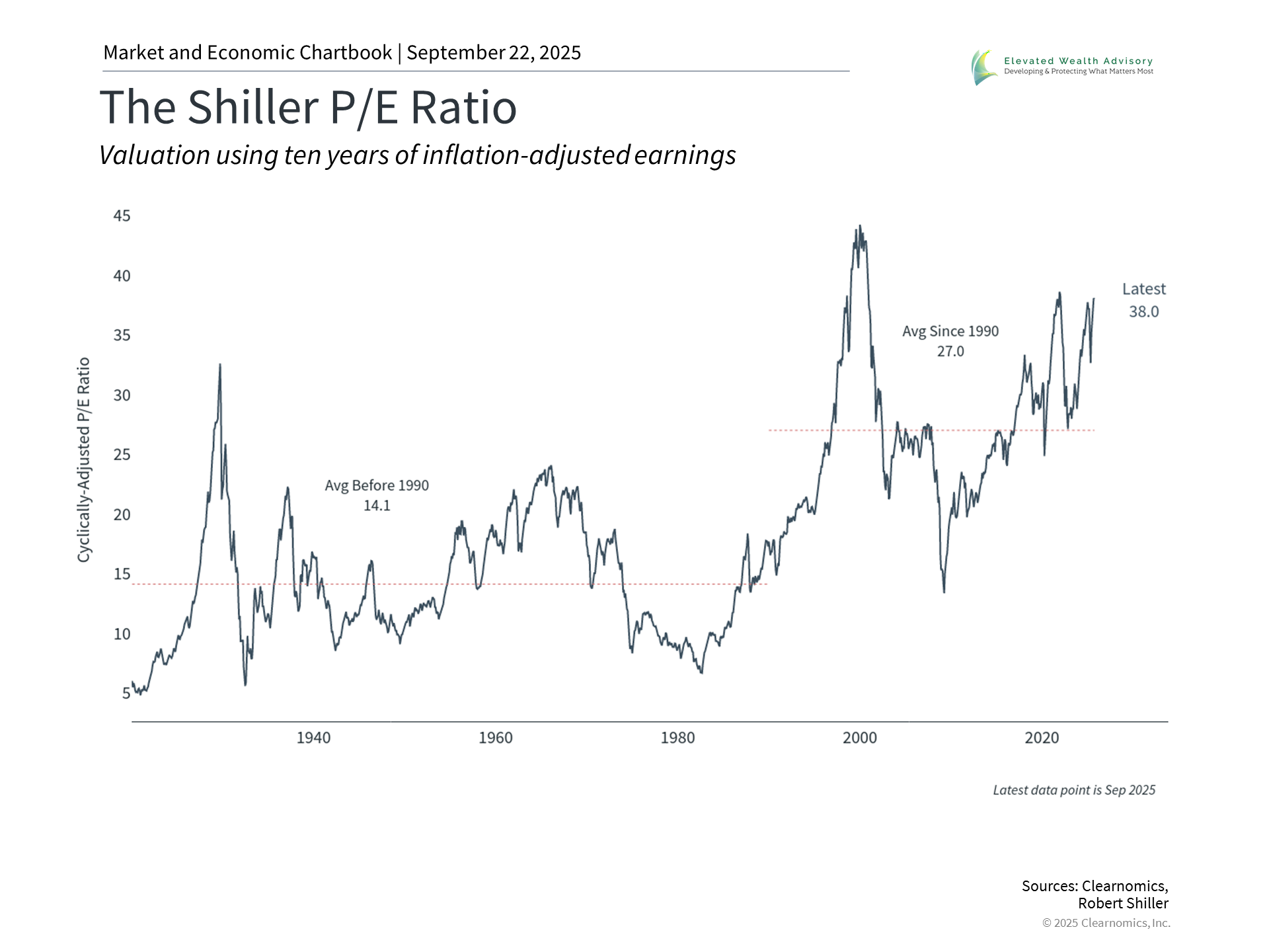 To distinguish between short-term pullbacks and the fear of a potential bubble, it's important to consider the concept of value. As with everything in life, what matters in investing isn't just what price you pay but what you get for your money. After all, the reason investors buy stocks is to own a part of a business and its cash flows. Valuation metrics such as price-to-sales or price-to-earnings tell us not just the price of a share, but what we're getting for that price. The accompanying chart shows the Shiller price-to-earnings ratio which provides perspective on long-term valuation trends by using inflation-adjusted earnings over the past ten years. The current level of 38x, which means that investors are paying $38 for each dollar of historical earnings today, is well above the average of 27x. This has fluctuated over the past few years as markets have navigated inflation, policy uncertainty, and volatility in technology stocks. With many measures showing that the stock market is expensive by historical standards, there are a few key points for investors to keep in mind. First, it's important to emphasize that valuations do not reliably predict stock market returns in the near term. Instead, they tell us how much investors are willing to pay based on their expectations about the future. Even when stocks appear expensive, markets can continue rising for months or years if business fundamentals remain strong. This is why trying to time the market can often be counterproductive. Second, while there are parallels to the 1990s tech boom since both periods feature high valuations and excitement around new technologies, there are some key differences. Unlike the unprofitable dot-com companies of the past, current market leaders are well established, have strong profitability, and healthy balance sheets. Just as the information technology revolution ultimately benefited all types of companies over the past few decades, so too could developments in artificial intelligence. Third, not all bubbles “pop.” While valuations can come back to Earth if prices fall, they can also improve if earnings and other fundamentals remain strong. Some of the enthusiasm experienced by the market today is in anticipation of higher future earnings. Corporate performance has justified some of these expectations in recent quarters with earnings growth coming in stronger than many had anticipated. Opportunities exist across a range of styles and sizes