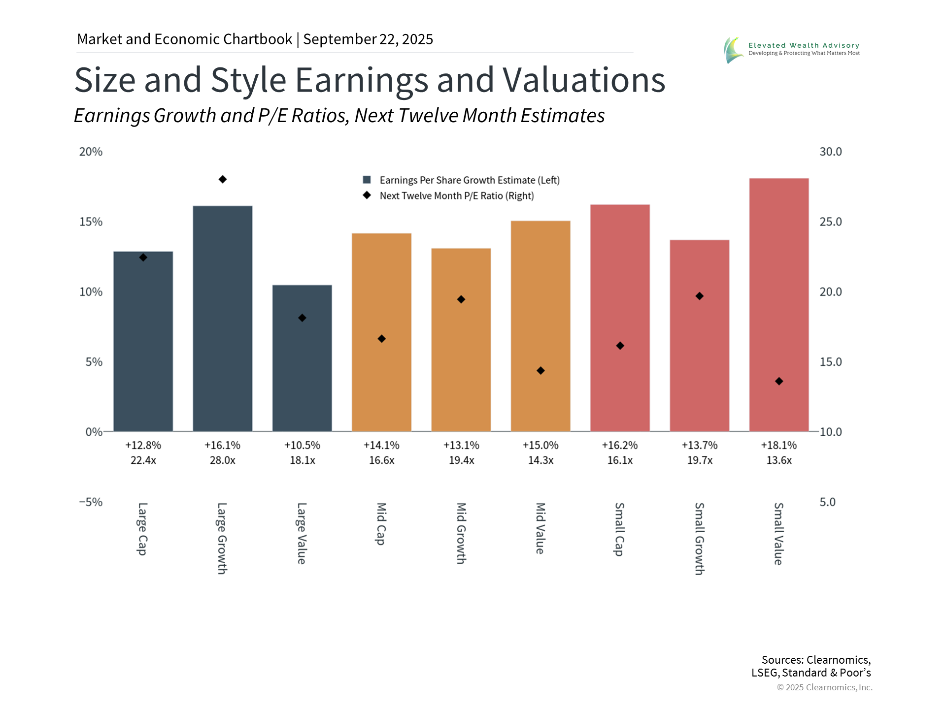 While valuations for the broad market are elevated, there are other areas that are more attractive. As the accompanying chart above shows, the price-to-earnings ratio for Large Cap Growth stocks is the highest at 28x. Other stock market sizes and styles, including Large Value and Small Caps, have more attractive valuations, even as they continue to experience healthy earnings growth. This is true across stock market sectors as well. Artificial intelligence-related companies are primarily concentrated in the Information Technology, Communication Services, and Consumer Discretionary sectors. In recent quarters, positive trends have broadened to other sectors with more attractive valuations too, including Financials, Industrials, and more. For investors, including a range of sizes, styles, and sectors in a portfolio not only helps reduce “concentration risk,” but can improve the overall valuations of holdings to better manage risk. It’s difficult to predict exactly which areas of the market will outperform over any given period, so holding an appropriate mix can help to improve portfolio balance. Time remains one of the most powerful investment tools