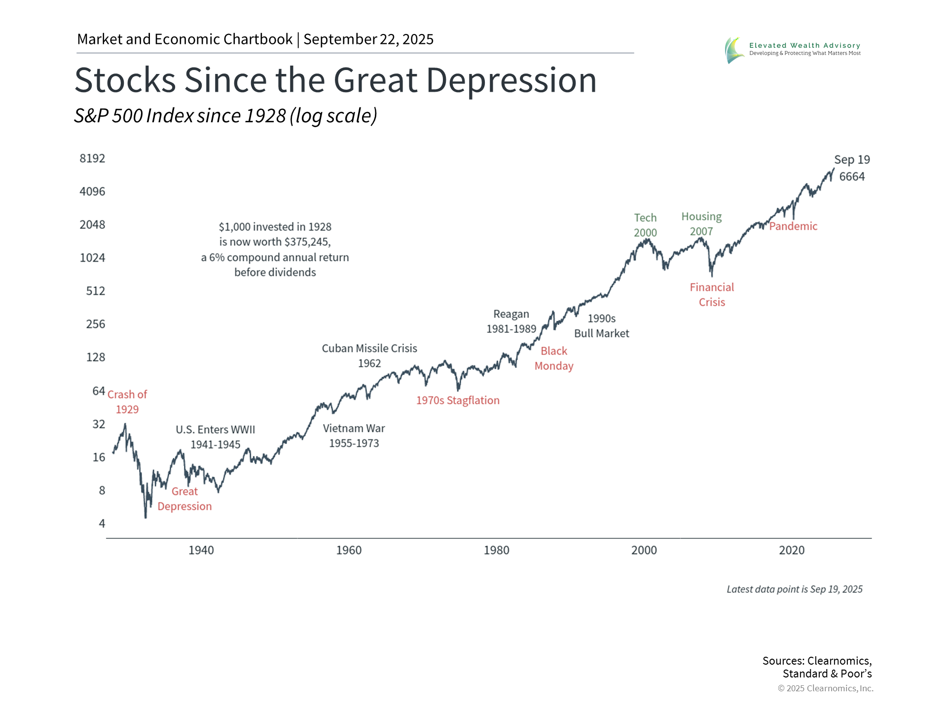 Perhaps the most important lesson from market history is that time tends to reward patient investors, even those who invest throughout periods of high valuations. As the chart above shows, some of the most impactful market events appear less dramatic when zooming out over years and decades - time horizons that are appropriate for many investors’ financial goals. For instance, the tech and housing bubbles, while challenging at the time, both experienced recoveries as the market rose to new all-time highs. This emphasizes the importance of not only portfolio positioning, but investment concepts that take advantage of longer timeframes such as dollar cost averaging. Even those who invested at the worst points in history, such as the 1929 market peak before the Great Depression, achieved positive returns over time. Starting during lower valuations generally produces better returns, but this advantage diminishes over extended time horizons. Concerns over a “bubble” have grown as the market continues to reach new all-time highs, and technology stocks continue to grow in importance. Rather than focusing on what this means for the market in the short run, investors should consider historical lessons and how they impact long-term portfolios. The bottom line? Today's market valuations are high due to strong earnings and business fundamentals. The key is maintaining a diversified portfolio that can benefit from growth while managing risk, something best done with professional guidance. | |||