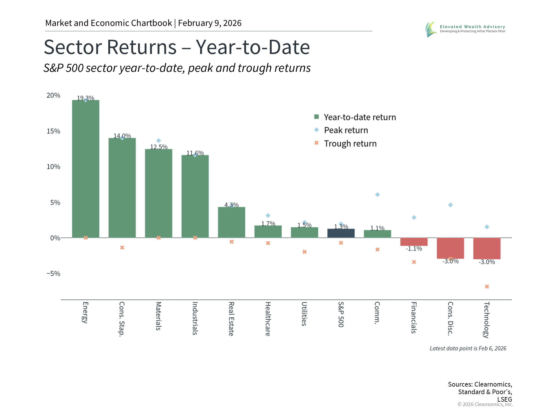 For investors, recent volatility underscores the principle that asset allocation matters more than any single trend or headline. The Information Technology and Communication Services sectors, while delivering strong returns in recent years, are also known to experience swings as expectations shift. These sectors are sensitive to long-term factors such as interest rates, and are thus affected by uncertainty around the Fed. So, while groups like the Magnificent 7 have performed well over the past several years, they can struggle in periods like 2022 just as they have over the past two months. Perhaps the biggest question is around stock market valuations. With the S&P 500's price-to-earnings ratio near historically elevated levels, investors have been rotating into other sectors such as Consumer Staples, Energy, Materials, and Industrials. This possibly reflects markets becoming more selective and focusing on opportunities beyond AI. After all, just because AI is the trend capturing investor attention does not mean there are not attractive opportunities across other parts of the market. It’s worth noting that cryptocurrencies have also experienced a significant pullback in recent months, with Bitcoin falling 50% to just above $60,000 before rebounding somewhat. This is a reminder that, from a portfolio perspective, cryptocurrencies remain highly volatile assets that can be sensitive to shifts in sentiment that often don’t have a simple explanation. For those interested in these assets, deciding how they fit into a balanced portfolio is far more important than trying to time the market. Ultimately, today’s AI trends should be viewed in a broader context along with other changes to the market and economic landscape. If past cycles are any indication, markets will likely over- and underreact to these trends in the short run. History shows that those who can stay patient and properly invested will be best positioned to achieve their financial goals. The bottom line? While AI is leading to a reassessment of specific stocks and sectors, the principles of long-term investing remain unchanged. Maintaining a portfolio aligned with your financial goals is still the best way to navigate periods of rapid change. | |||
