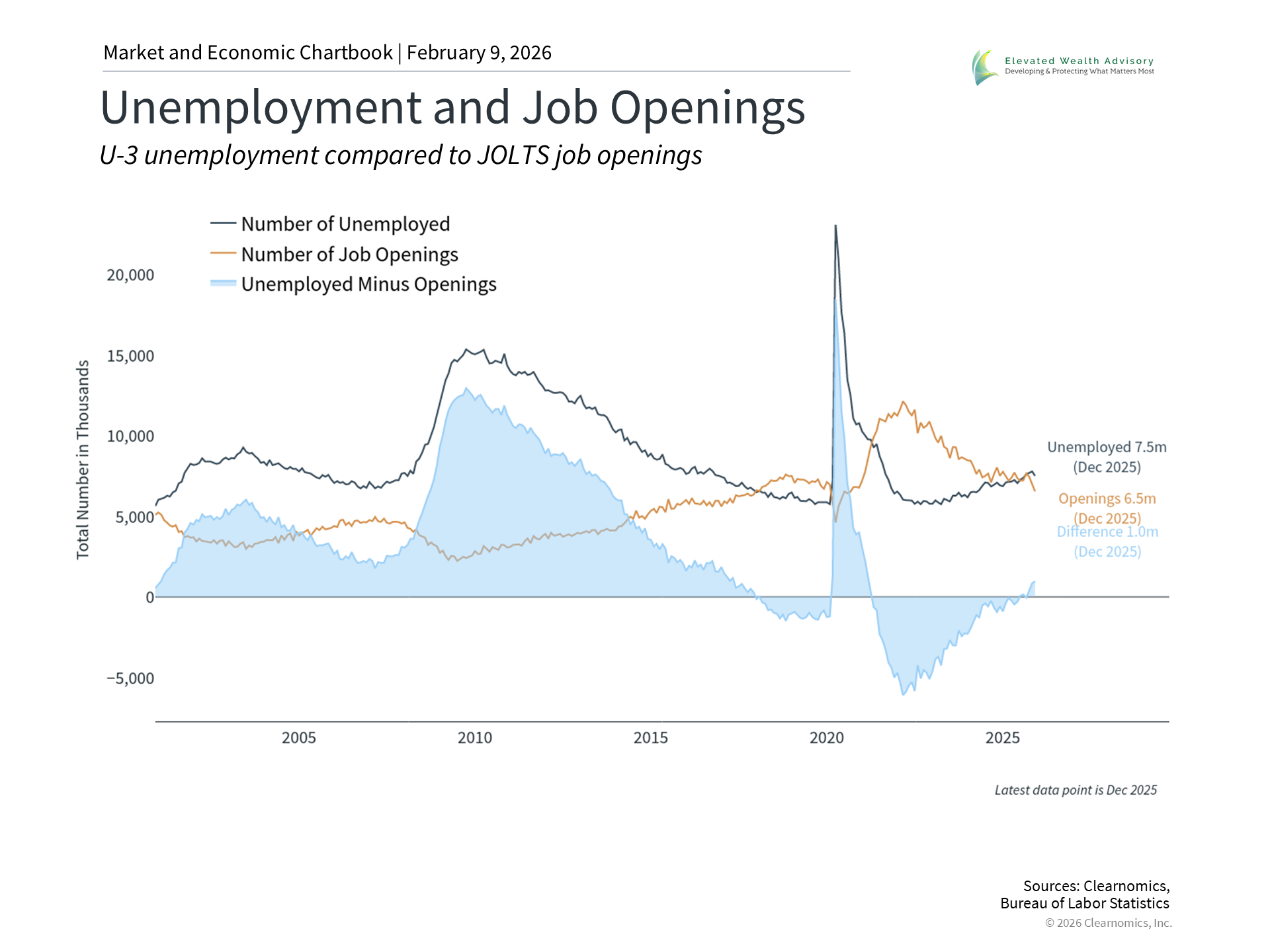 Adding to investor concerns is a labor market that has weakened since the middle of 2025. The latest data published by the Bureau of Labor Statistics showed that job openings fell to their lowest level since 2020 in December. At its peak, there were more than two job openings per job seeker, but now the ratio is less than one, with about 6.5 million openings for 7.5 million unemployed individuals. Meanwhile, a report by Challenger, Gray & Christmas showed that job cuts soared to 108,435 in January, a 118% year-over-year jump and the highest level for the month since 2009. There is no direct evidence yet that these job cuts are AI-related, but these trends affect the broad economic outlook nonetheless. In the long run, every major technological wave, from the Industrial Revolution to the Information Technology Revolution, has eventually created more jobs than it replaced, but the transition periods as workers are retrained can be difficult for both individuals and society. In the meantime, a weaker job market has raised concerns among some investors after years of better-than-expected economic growth. This also has implications for the broader outlook and the path of Federal Reserve policy. It’s important to keep in mind that other economic data remain healthy, including ongoing consumer spending driven by household wealth near record levels and inflation which has held steady below 3%. So, while there are some economic challenges, there is also reason to believe the economy could continue to grow at a healthy pace. What these trends mean for portfolios