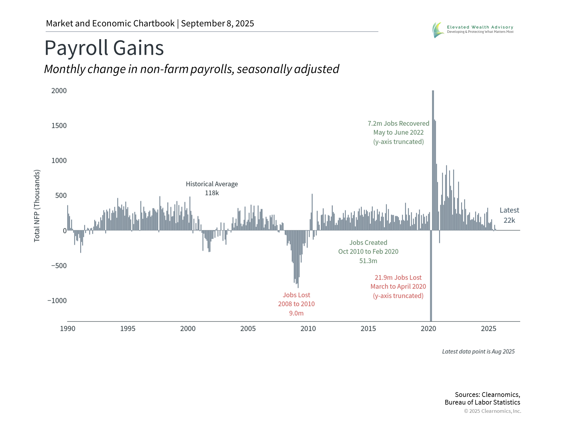 It’s tempting to focus only on the liability side of consumers’ balance sheets, since this is often where problems begin. However, the asset side is just as important, and U.S. household net worth remains near record levels today. This is highlighted in the chart above. At $169 trillion, net worth has increased over the past 15 years due to steady economic growth, rising housing prices, and strong stock market returns. Again, this reflects a two-speed economy since those households that have borrowed more in recent years may not be the same households benefiting from rising asset prices. Still, this wealth effect, where rising asset values support consumer spending, can help provide economic stability. This is one reason the many concerns of the past few years have not always directly translated into a weaker economy. This is also a reminder of what drives wealth creation over time, and why it’s important to hold a portfolio tailored to financial goals. Over this period, there were many times when investors worried about recessions. While markets can react to negative data points or experience pullbacks in the short run, they often “climb the wall of worry” in the long run. For patient investors, focusing on where the long-term economy is headed is far more important than dwelling on where it’s been. The bottom line? While the job market has slowed, raising the odds of Fed rate cuts beginning in September, it is only one component of the overall economic picture. When the outlook is uncertain, investors should focus on the underlying economic trends to stay balanced in their portfolios. 1. https://www.federalreserve.gov/newsevents/speech/powell20250822a.htm | |||