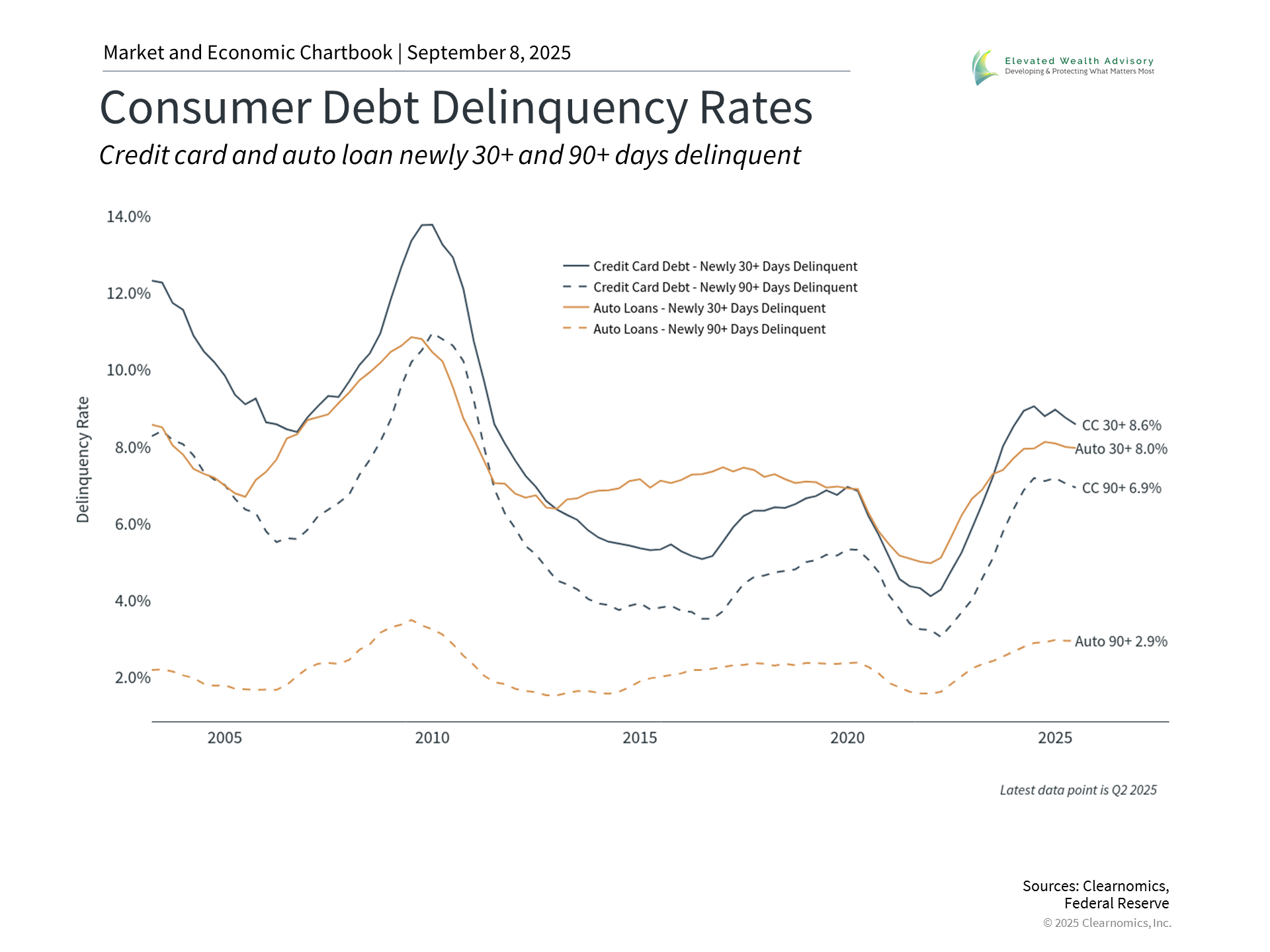 To understand the financial health of consumers, it helps to look at the job market. The latest jobs report provided further evidence that the labor market is slowing more than previously expected. Only 22,000 jobs were added in August according to the Bureau of Labor Statistics, well below the 75,000 that economists had anticipated. The report also included substantial revisions to figures from previous months, with June’s payroll number showing the economy lost 13,000 jobs that month, marking the first decline since 2020. While these figures are important and have been covered widely in the financial media, economists don't focus solely on headline payroll numbers, which can swing from month to month. Instead, they look at the trends and consider what's known as "labor market slack.” Put simply, this measures whether people who are looking for work can find it. Fed Chair Jerome Powell recently described the current job market as being in “a curious kind of balance” since both the supply of workers and demand for them have slowed.1 Specifically, the fact that the unemployment rate sits at only 4.3% is a positive sign that many who would like to work are able to. The “under-employment” rate, which includes workers who have given up, is also still historically low at 8.1%. Other reports show that there is still roughly one job opening for each unemployed individual across the country. While this does not mean everyone will find a job, it shows that companies are still hiring. This matters because, when combined with the payroll numbers, it suggests the labor market is cooling gradually rather than collapsing suddenly. The key difference is that spikes in unemployment have historically only occurred due to economic shocks, such as the 2008 financial crisis or the 2020 pandemic. In contrast, the current environment seems to reflect natural shifts in the economy. For the Fed, this employment trajectory further raises the chance of additional rate cuts beginning in September. Consumer finances show resilience despite challenges