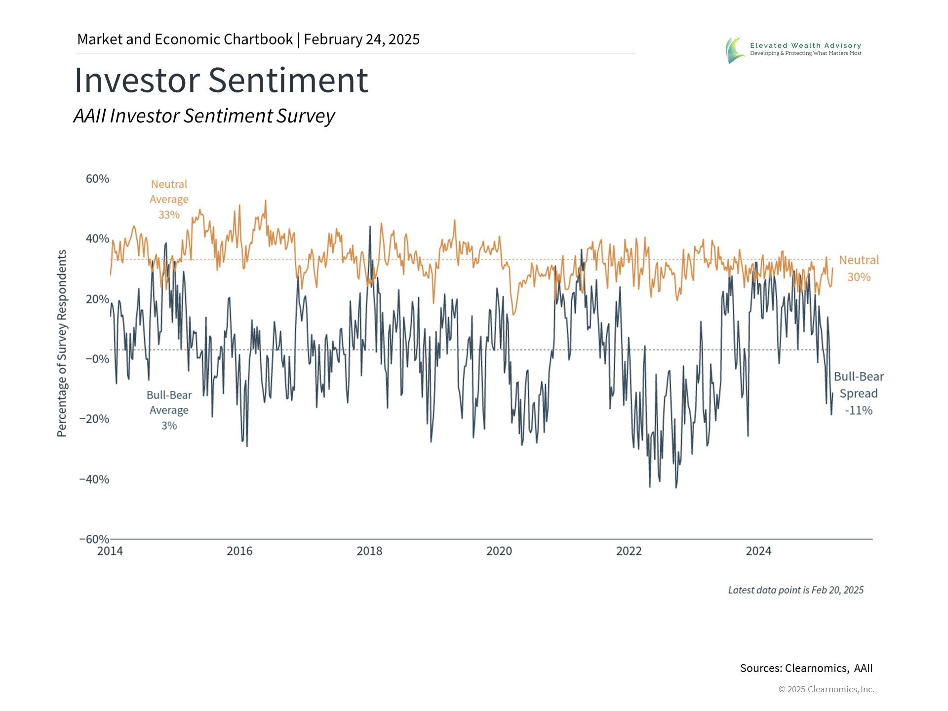 According to the latest AAII Investor Sentiment Survey, which measures how investors feel about the market, bearish attitudes have recently outpaced bullish ones by as much as 19%. This is the most pessimistic investors have felt since late 2023 when some expected the economy to fall into recession. It’s clear from the accompanying chart that these feelings can change quickly. There is often a gap between how investors perceive markets and how they actually perform. Despite day-to-day market swings and worsening sentiment, major stock market indices have experienced positive returns over the past several months. This underscores the fact that investor sentiment is often a contrarian indicator. As Warren Buffett’s quote suggests, the greatest market opportunities tend to present themselves when investors are the most worried. Historically, this is because investor emotions can change quickly and don’t always accurately reflect what will drive markets in the future. There are many historical examples of markets rallying despite investor negativity. A few include the “unloved bull market” after the 2008 global financial crisis, in 2017 amid trade war concerns, in 2020 following the pandemic, after 2022 when the market hit bear market levels, and many others. In reality, it’s when investors feel exuberant that extra caution is needed. Proper portfolio construction balances risk and reward
