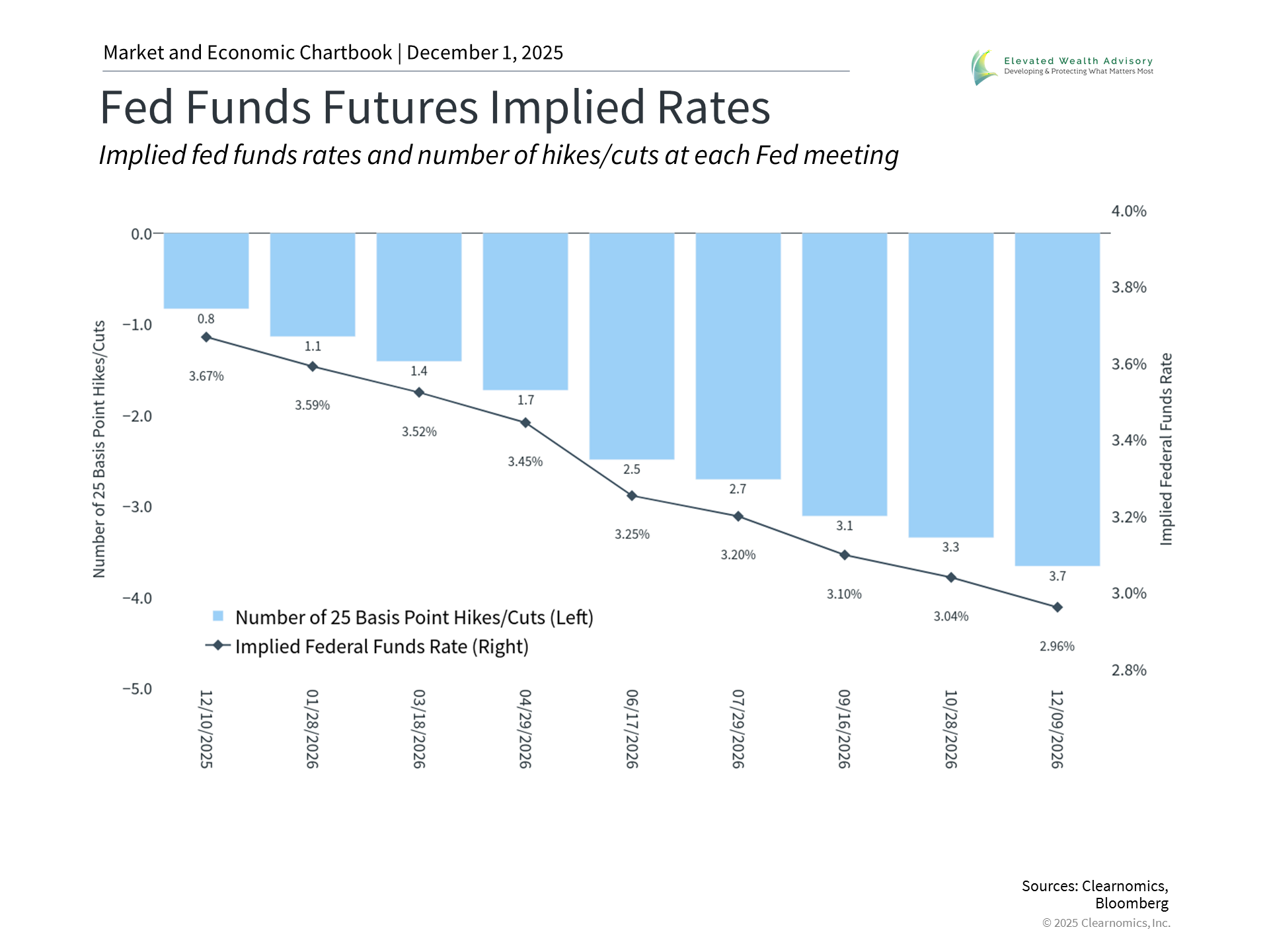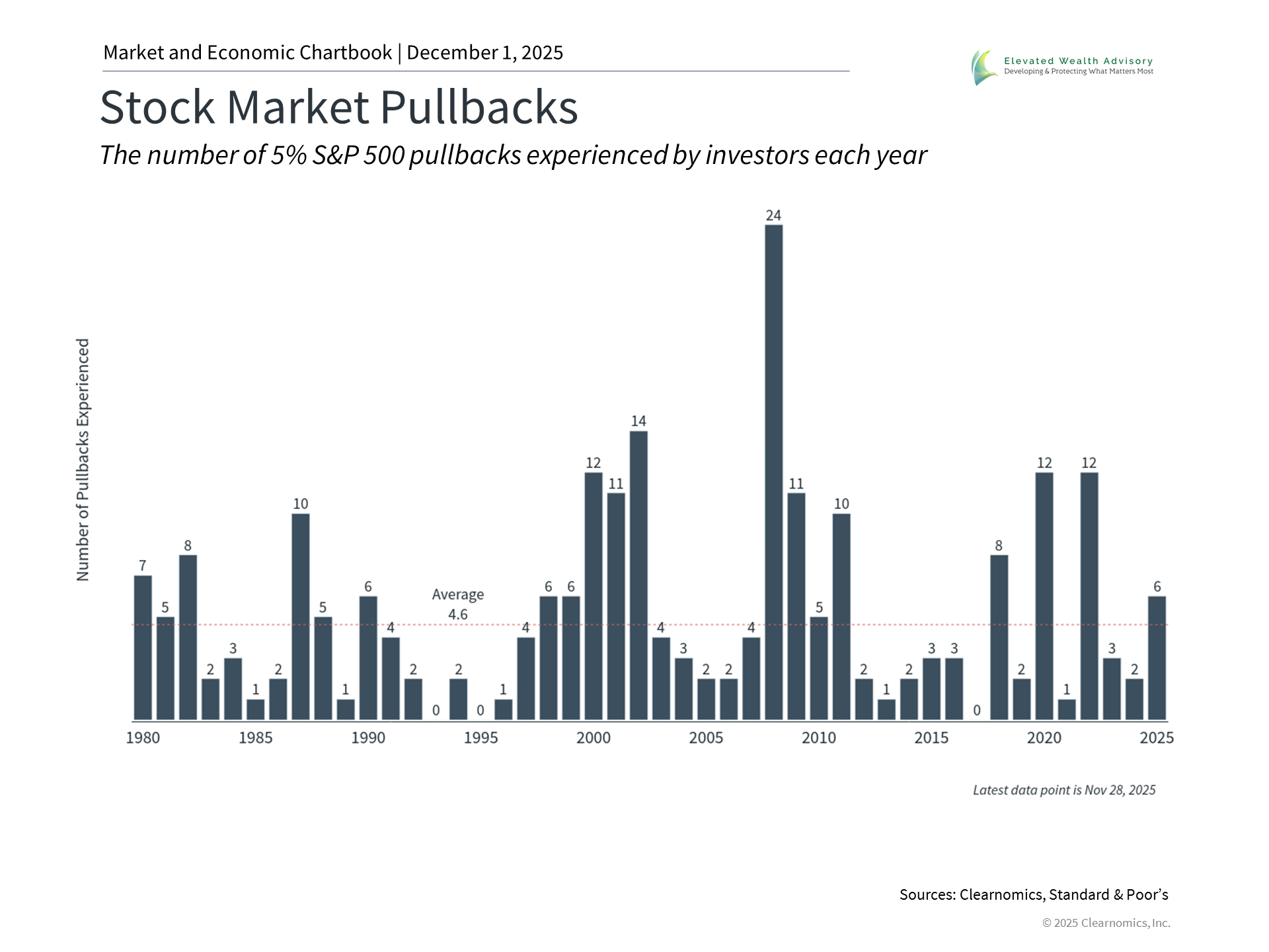 November saw investors temporarily move away from risk assets such as technology stocks, high-yield bonds, cryptocurrencies, and other investments. This was primarily due to questions around the sustainability of AI investments and investors adjusting their expectations around upcoming Fed rate cuts. There have now been six declines of 5% or worse for the S&P 500 this year, the most since 2022 but still close to the historical average. Some major asset classes rebounded in the final days of the month, and the S&P 500 ended slightly positive. During the month, AI-related technology stocks experienced their worst week since April. Concerns about their spending and debt levels, profit margins, and questions around a potential bubble created volatility. Yet beneath this, fundamentals remained strong with companies such as Nvidia reporting healthy revenue and earnings growth for the third quarter. Some stocks, including those in the Magnificent 7, rebounded following these reports. Cryptocurrencies experienced a sharp correction during this risk-off period. Bitcoin fell over 30% from its early October highs above $125,000, briefly trading below $85,000 and wiping out its year-to-date gains. While the adoption of cryptocurrencies by investors has grown, such periods demonstrate that these and similar assets can be highly speculative and prone to boom-and-bust cycles. For this reason, ongoing risk management and maintaining a proper asset allocation continue to be important. The bond market rose in November, partly driven by a decline in long-term interest rates with the 10-year Treasury yield briefly falling below 4% once again. This was the result of new expectations around government policy which could result in lower rates in the long run. Year-to-date, the Bloomberg U.S. Aggregate Bond Index has gained 7.5%, the best performance since 2020. This has helped provide balance to diversified portfolios. The government shutdown ended but economic uncertainty remains