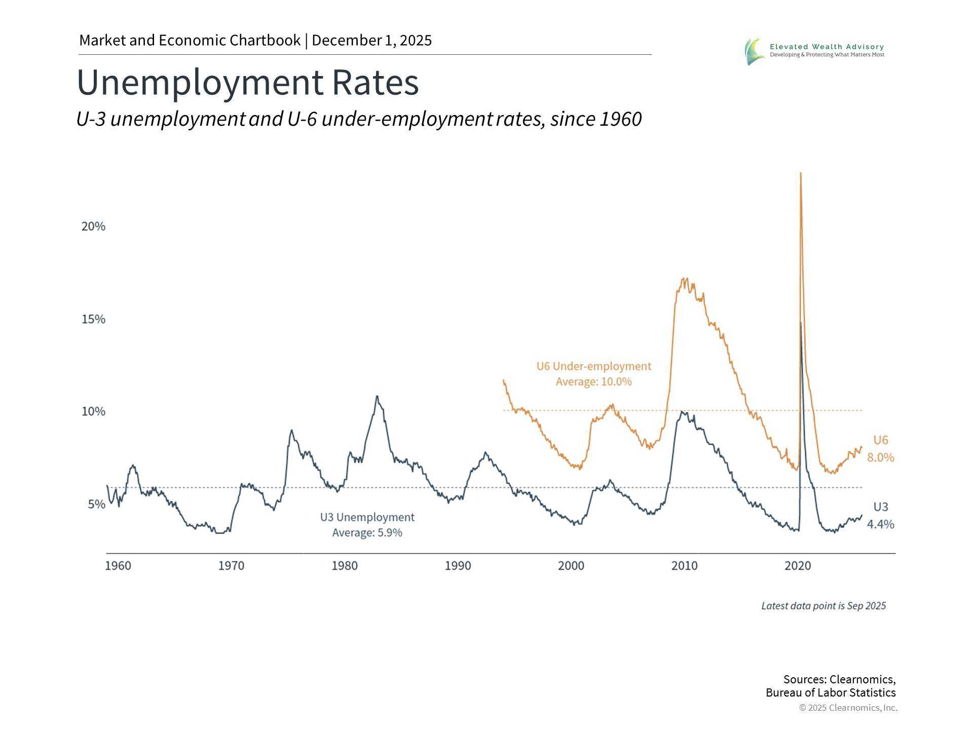 The longest government shutdown in history ended after 43 days, but the federal government will only be fully funded through the end of January 2026. This means that political uncertainty will be in the headlines again in only a couple of months. That said, markets were generally able to look past the shutdown, even with greater challenges due to a lack of economic data. The Bureau of Labor Statistics released the long-awaited September jobs report, which was originally scheduled to be published in October. This report showed that job gains exceeded expectations that month, rebounding from weakness over the summer. However, the revised figures show that 4,000 jobs were lost in August, the second month of negative jobs growth this year. The unemployment rate edged up to 4.4% in September, its highest level since October 2021, although this is still low by historical standards. A full October jobs report will not be published since surveys of households and businesses were not conducted during that month, but some of the data will be published with November’s report on a delayed basis. Market expectations for the next Fed rate cut have shifted