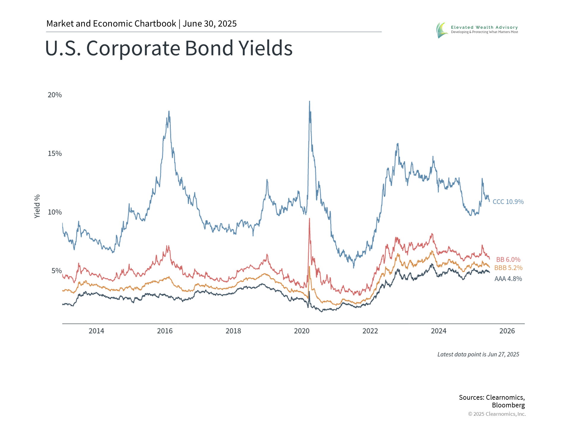 The positive momentum in stocks has been accompanied by similar strength in the bond market, especially for corporate bonds. Bonds are categorized by their credit quality, which is a measure of how likely it is for investors to be repaid. The interest rates on these bonds have fallen recently, both in absolute terms and compared to Treasury yields. This is often described as credit spreads “tightening,” which is positive for investors since it means the prices of these bonds are rising. This occurs because when the economy is stable and the stock market is strong, there is greater confidence in the ability of companies to service their obligations. This is why there is often a positive correlation between the stock market and credit markets, since they mirror the same underlying drivers. When investors push stocks to record levels, corporate bond prices also tend to benefit from optimism about economic conditions and corporate health. This has supported the Bloomberg U.S. Aggregate Bond Index, a diversified index of different U.S. bonds, with a 3.7% return so far this year. The corporate bond component of the index has also generated 3.7%, while high yield has outperformed with a 4.3% return. Tightening credit spreads also suggest that the flight-to-safety that occurred earlier this year has largely faded for the time being. Lower credit spreads can also be positive for the underlying economy since they allow companies to raise funds, finance new projects, and roll over existing debt more easily. For investors, this is a reminder that while the stock market receives the most attention, many other asset classes have supported portfolios this year as well. With the S&P 500 at record highs, it’s a great time to review your asset allocation and ensure that your financial plan is set up for all phases of the market cycle. Asset allocation remains important despite strong performance