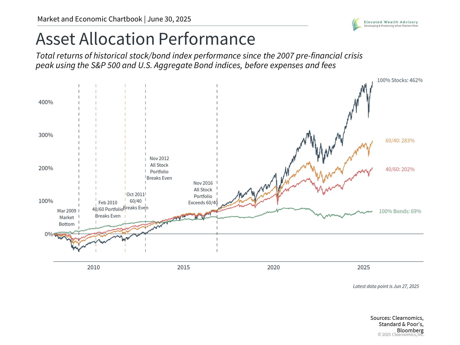 While the strength in both stocks and bonds is encouraging for investors, it also underscores the importance of maintaining disciplined portfolio management. Building a portfolio is not just about investment returns. Instead, what matters is the balance of risk and returns, and how each asset class contributes to this overall balance. Doing so properly, with an eye toward long-term financial goals, can ideally lead to a portfolio that supports investors across changing market environments. Recent years have provided clear examples of how different asset classes can perform in varying market conditions. The accompanying chart highlights how different asset allocations perform over both good and bad periods. Those portfolios that are heavily invested in stocks may outperform when the market is expanding, but will also typically experience larger swings during downturns. Including bonds can make the ride smoother, which likely helps to ensure that financial goals are met. Which path makes the most sense depends on your particular risk tolerance and return objectives. Having a comprehensive view of your goals and financial needs allows you to tailor a portfolio to withstand the next period of volatility, when it inevitably occurs. The bottom line? While the market has bounced back, investors should maintain disciplined portfolio management rather than chasing recent performance. History shows that staying invested through market cycles remains the best approach to achieving long-term financial goals. | |||