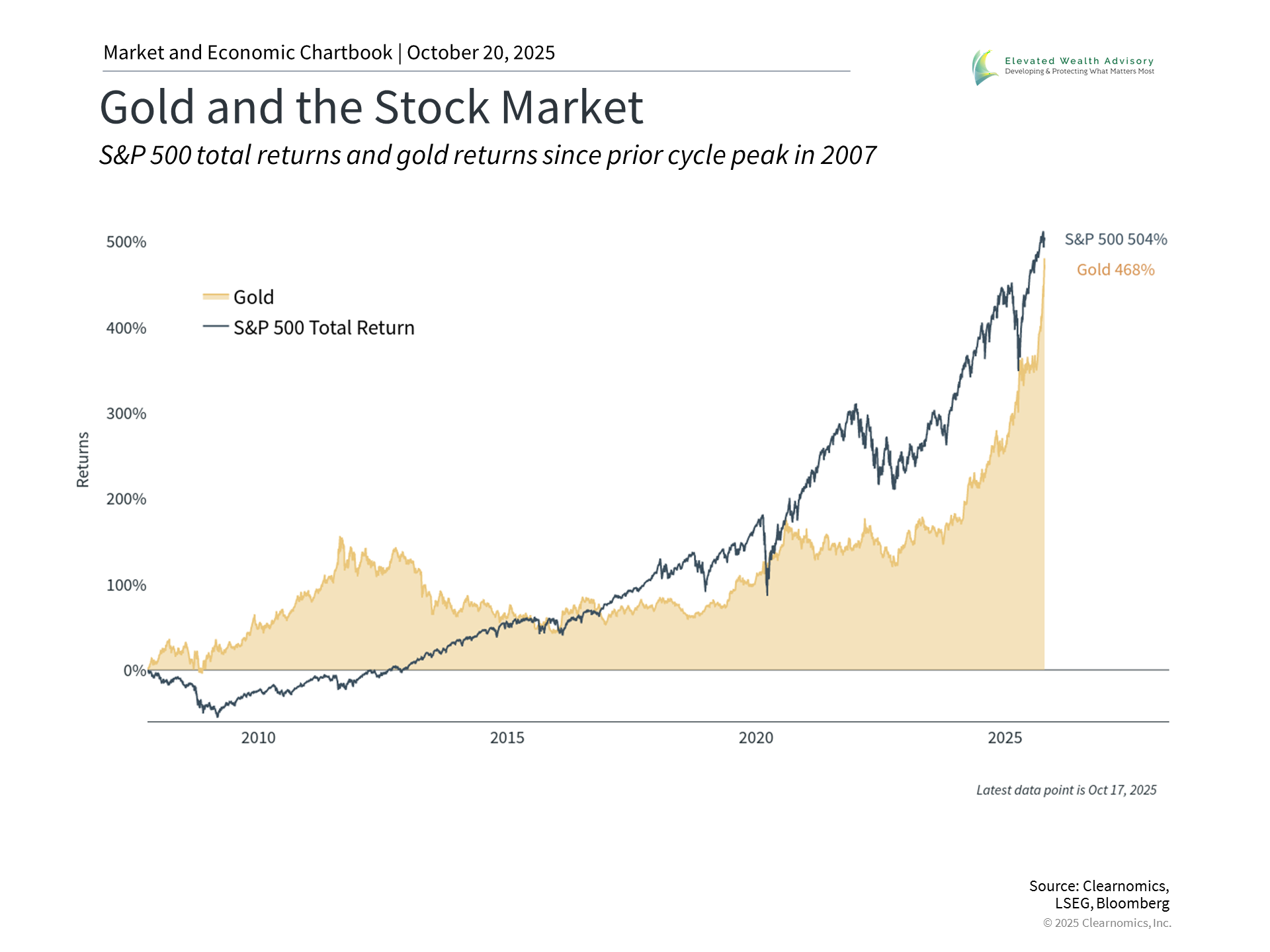 As a speculative asset, it's understandable that gold tends to capture the attention of investors. Over the past several decades, gold has experienced dramatic rallies with mixed results. In the late 1970s, gold surged as investors worried about stagflation and Fed independence. Its price peaked above $800 in 1980 - a level it wouldn't reach again until 2007. A similar pattern occurred after the 2008 financial crisis when central banks poured stimulus into the financial system. At the time, many investors justifiably worried about runaway inflation and the collapse of the dollar, neither of which occurred. Gold doubled from 2009 to 2011, reaching about $1,900 per ounce, before falling back toward $1,000 over the next few years. This was the case even though the Fed did not begin to reduce stimulus measures until 2013, or raise rates off the zero lower bound until 2015. The accompanying chart shows gold's performance compared to the S&P 500 since the market peak in 2007. While gold has had periods of strong performance that create diversification benefits, the S&P 500 has still outperformed over the full period. For investors focused on the daily swings in the stock market, this fact may seem surprising. Once again, this speaks to the need to view all asset classes from a portfolio perspective. Many asset classes have contributed to portfolio returns this year