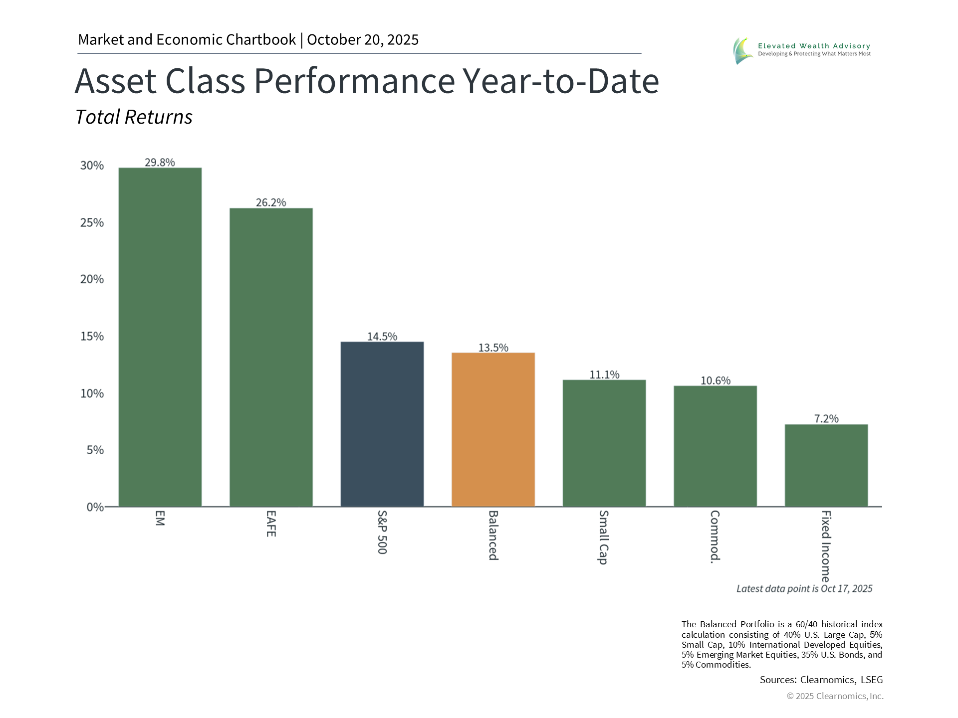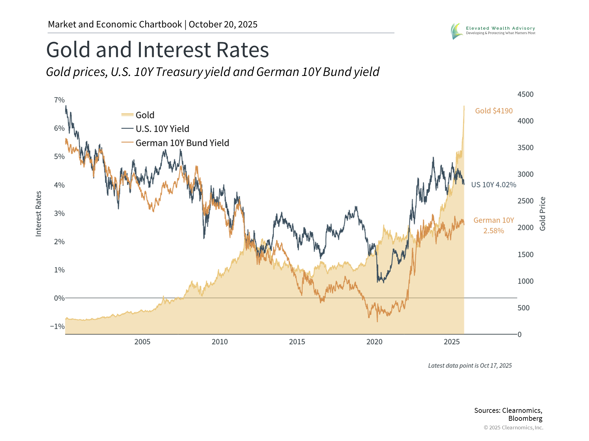 The current gold rally, which began in 2024, is intertwined with strong performance across many assets, including artificial intelligence stocks, such as the Magnificent 7, international stocks, bonds, and cryptocurrencies. The accompanying chart shows that many asset classes have contributed to portfolio returns this year. While gold has certainly performed well, there will always be individual stocks and other assets that perform well in a particular year. For many investors, gold plays a role as part of a broader commodities allocation, possibly related to other alternative asset classes. The Bloomberg Commodity Index, for instance, began the year with a 14.3% target weight in gold. Together with other commodities such as silver, industrial metals, energy, grains, and more, this index has gained 10.6% year-to-date. There are other reasons to favor holding many different asset classes that are aligned toward long-term financial goals. One classic challenge is that gold generates no income, unlike bonds or dividend-paying stocks. So, a portfolio inappropriately weighted toward gold sacrifices the longer-term growth potential of stocks and the income of bonds. The bottom line? Some investors are concerned by the debasement of the dollar, especially as gold continues to rally. Investors should view gold as one component of a broader portfolio that is aligned with long-term financial goals. | |||